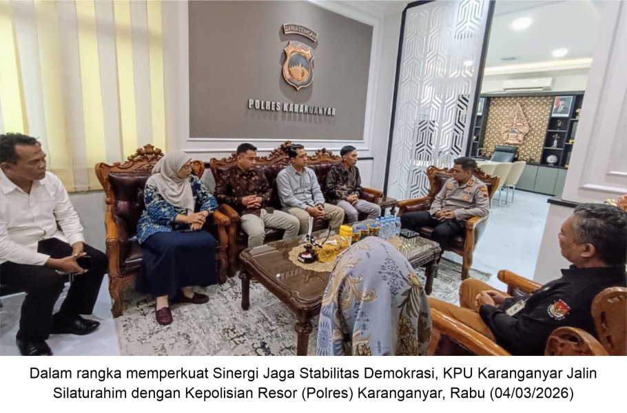 KARANGANYAR - Dalam rangka memperkuat Sinergi Jaga Stabilitas Demokrasi, KPU Karanganyar Jalin Silaturahim dengan Kepolisian Resor (Polres) Karanganyar, Rabu (04/03/2026). Kehadiran KPU Karanganyar diterima langsung Kepala Polres (Kapolres) Karanganyar, AKBP Arman Sahti, didampingi Kasat Intelkam, Iptu Untung Basuki. Rombongan KPU Karanganyar dipimpin Ketua beserta Anggota, didampingi Sekretaris dan Kasubbag Sekretariat KPU Karanganyar.