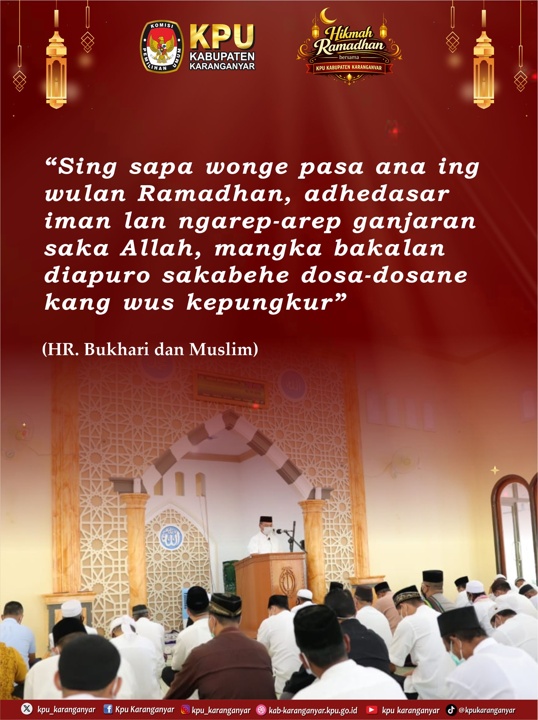 #Temanpemilih, hikmah ramadhan bersama KPU Karanganyar kali ini mari kita dengarkan hadist dari Bukhari dan Muslim.