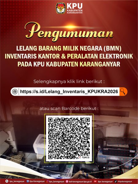 #Temanpemilih, KPU Karanganyar akan melaksanakan lelang BMN berupa satu paket inventaris kantor dan peralatan elektronik melalui perantara Kantor Pelayanan Kekayaan Negara dan Lelang (KPKNL) Surakarta.