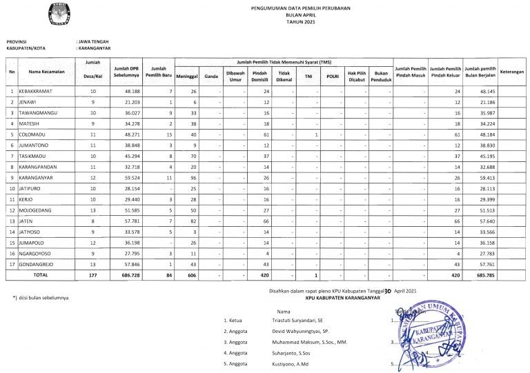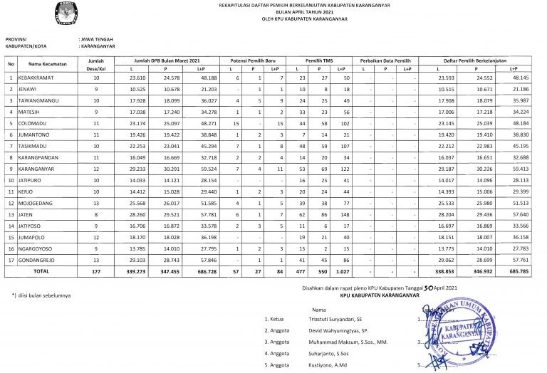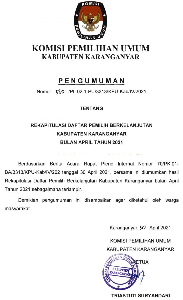 Pengumuman Rekapitulasi Daftar Pemilih Berkelanjutan April Tahun 2021 Jumat, 30 April 2021 00:00 83 Formulir A-DPB bulan April 2021 DOWNLOAD Form Rekapitulasi dan Model A.1-DPB bulan April 2021 DOWNLOAD Bagikan: Telah dilihat 83 kali