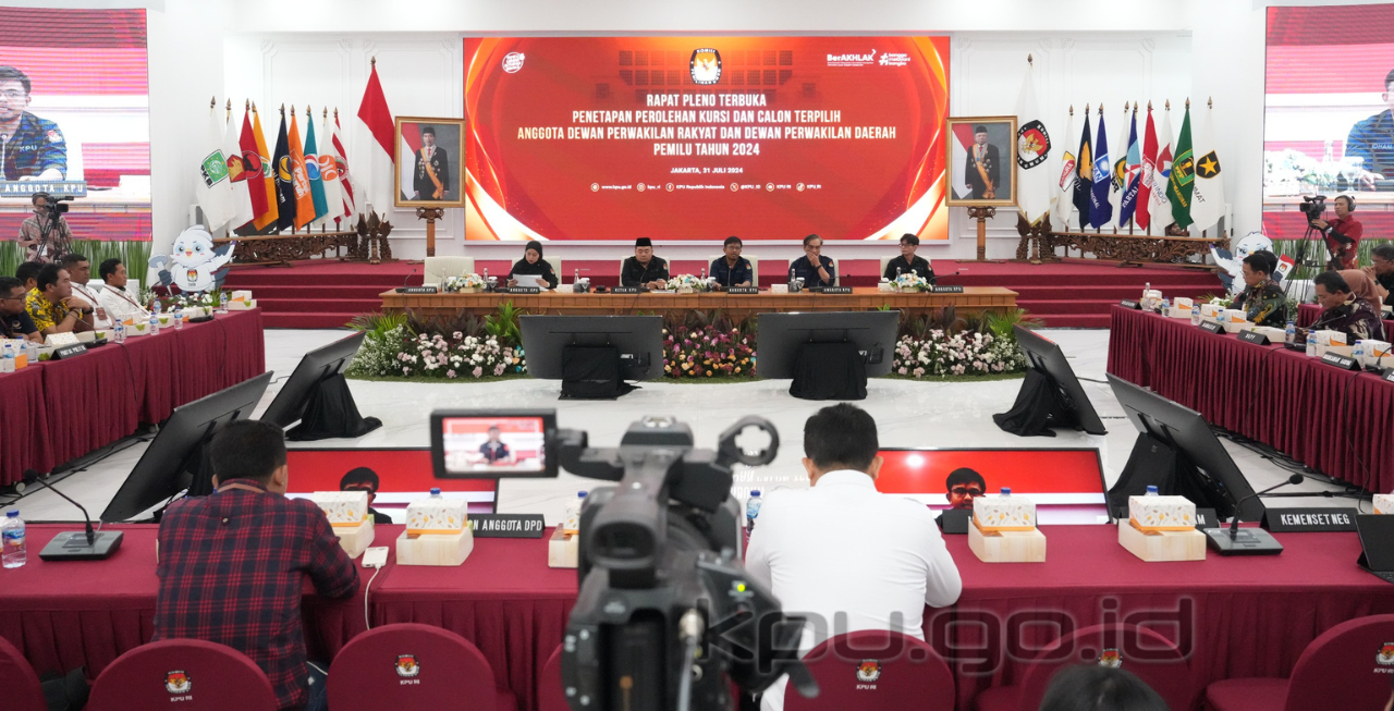 Jakarta, kpu.go.id – Tiga hari pasca Rapat Pleno Terbuka Rekapitulasi Hasil Penghitungan Perolehan Suara Tingkat Nasional serta Penetapan Hasil Pemilu Serentak Tahun 2024 Pasca Pelaksanaan Putusan Mahkamah Konstitusi (MK), Komisi Pemilihan Umum (KPU) menggelar Rapat Pleno Terbuka Penetapan Perolehan Kursi dan Calon Terpilih Anggota Dewan Perwakilan Rakyat dan Dewan Perwakilan Daerah Pemilu Tahun 2024, di Ruang Sidang Utama KPU, Rabu (31/7/2024).