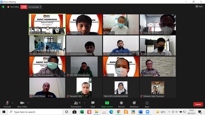 Dinas terkait yang diundang antara lain Kepolisian Resort Karanganyar, Kodim 0727 Karanganyar, Disdukcapil Kabupaten Karanganyar, Pengadilan Negeri Karanganyar, Kementerian Agama Karanganyar, Pangkalah Lanud Adi Sumarmo Karanganyar dan Partai Politik tingkat Kabupaten Karanganyar serta Bawaslu Kabupaten Karanganyar. Rakor dengan instansi terkait digelar melalui via daring melalui aplikasi zoom.