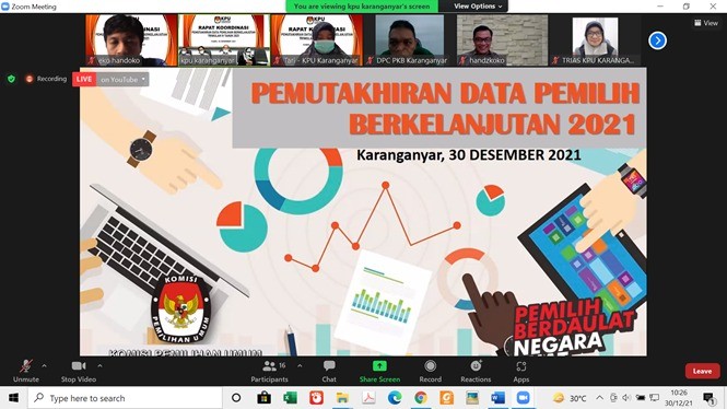 KARANGANYAR - KPU Karanganyar menetapkan 677.501 orang pemilih dalam Rapat Pleno Pemutakhiran Data Pemilih Berkelanjutan (PDPB), kamis (30/12/2021). Penetapan diawali dengan Rapat Koordinasi Data Pemilih Berkelanjutan Triwulan IV Tahun 2021 dengan mengundang berbagai pihak terkait.