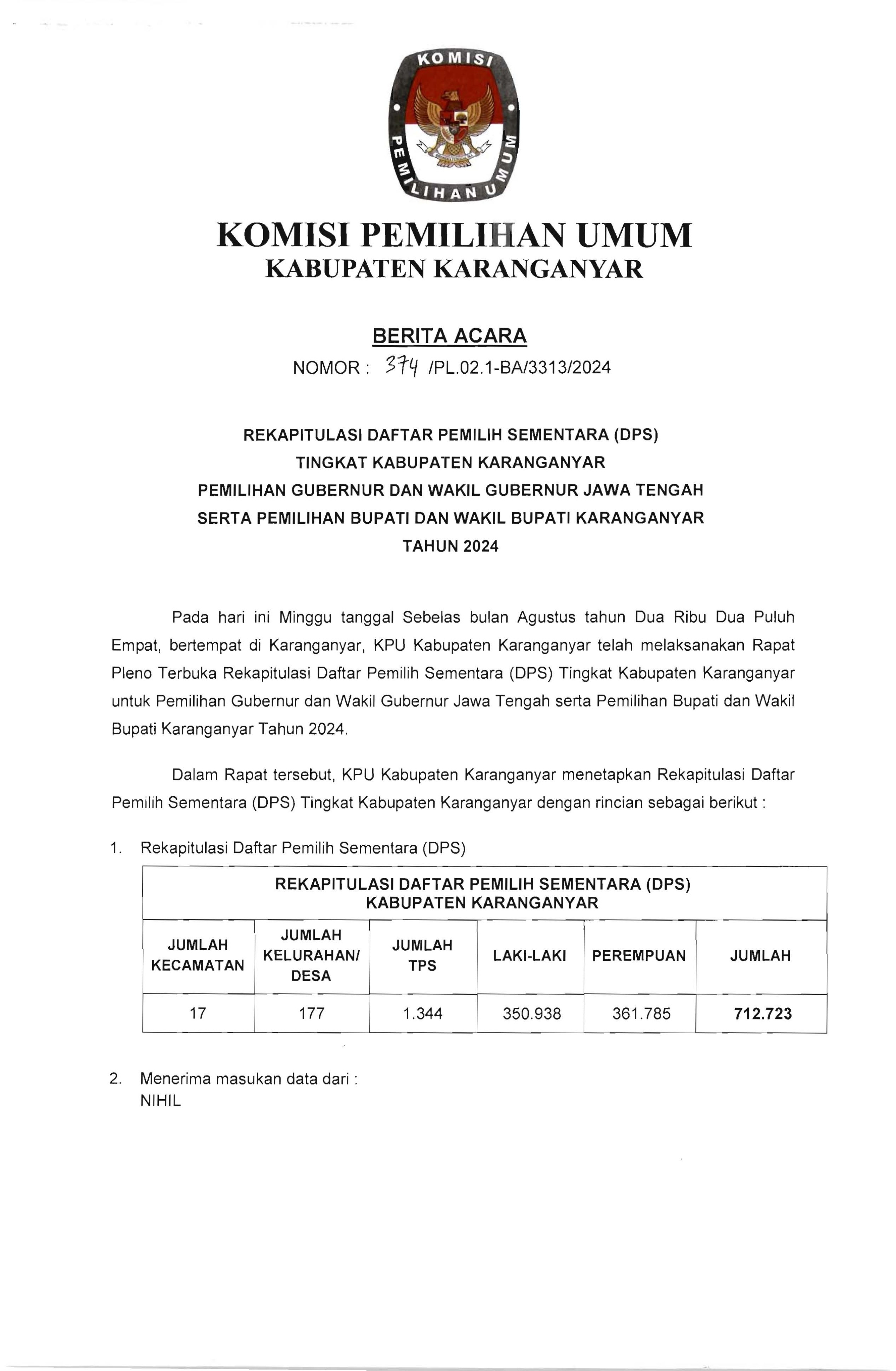 BA Rekapitulasi DPS Tingkat Kabupaten Karanganyar Pilkada Serentak 2024