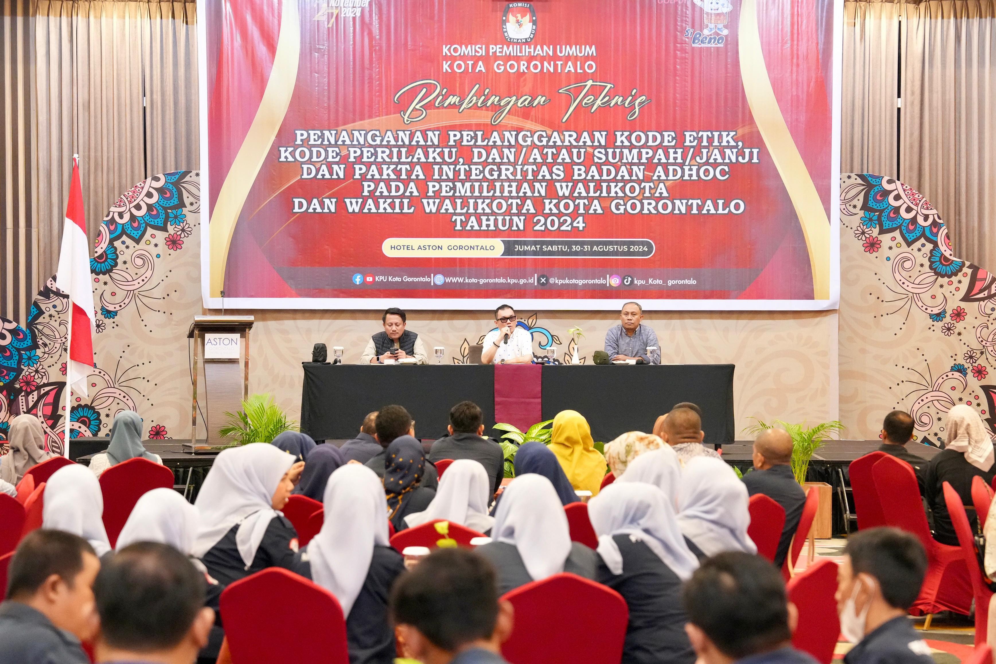 Gorontalo, kpu.go.id- Anggota KPU Parsadaan Harahap hadir dan memberikan arahan dalam kegiatan Bimbingan Teknis Penanganan Pelanggaran Kode Etik, Kode Perilaku, dan/atau Sumpah/Janji dan Pakta Integritas Badan Adhoc pada Pemilihan Walikota dan Wakil Walikota Kota Gorontalo Tahun 2024, Jumat (30/8/2024).