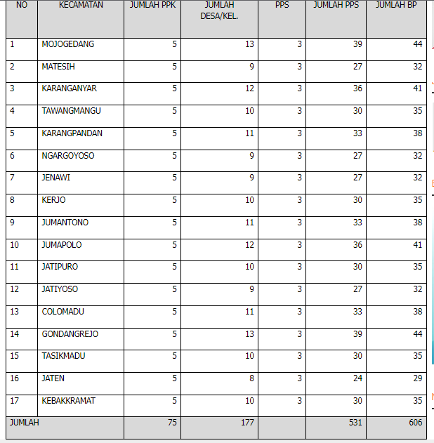 BERIKUT JUMLAH BADAN PENYELENGGARA (BP) Panitia Pemilihan Kecamatan(PPK) dan PPS untuk Pemilu Bupati Karanganyar Tahun 2013 se-Kabupaten Karanganyar :
