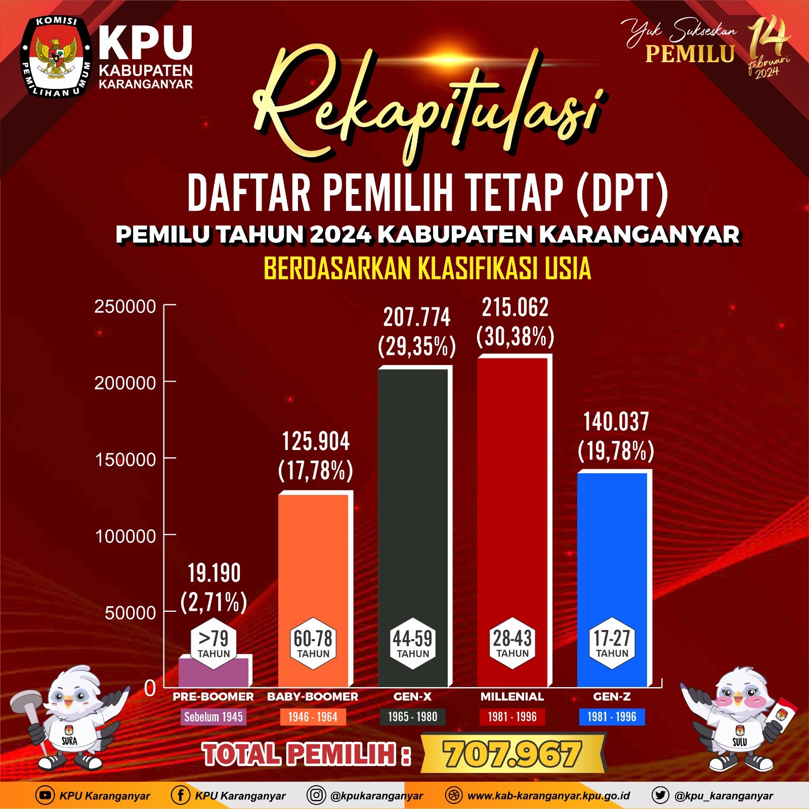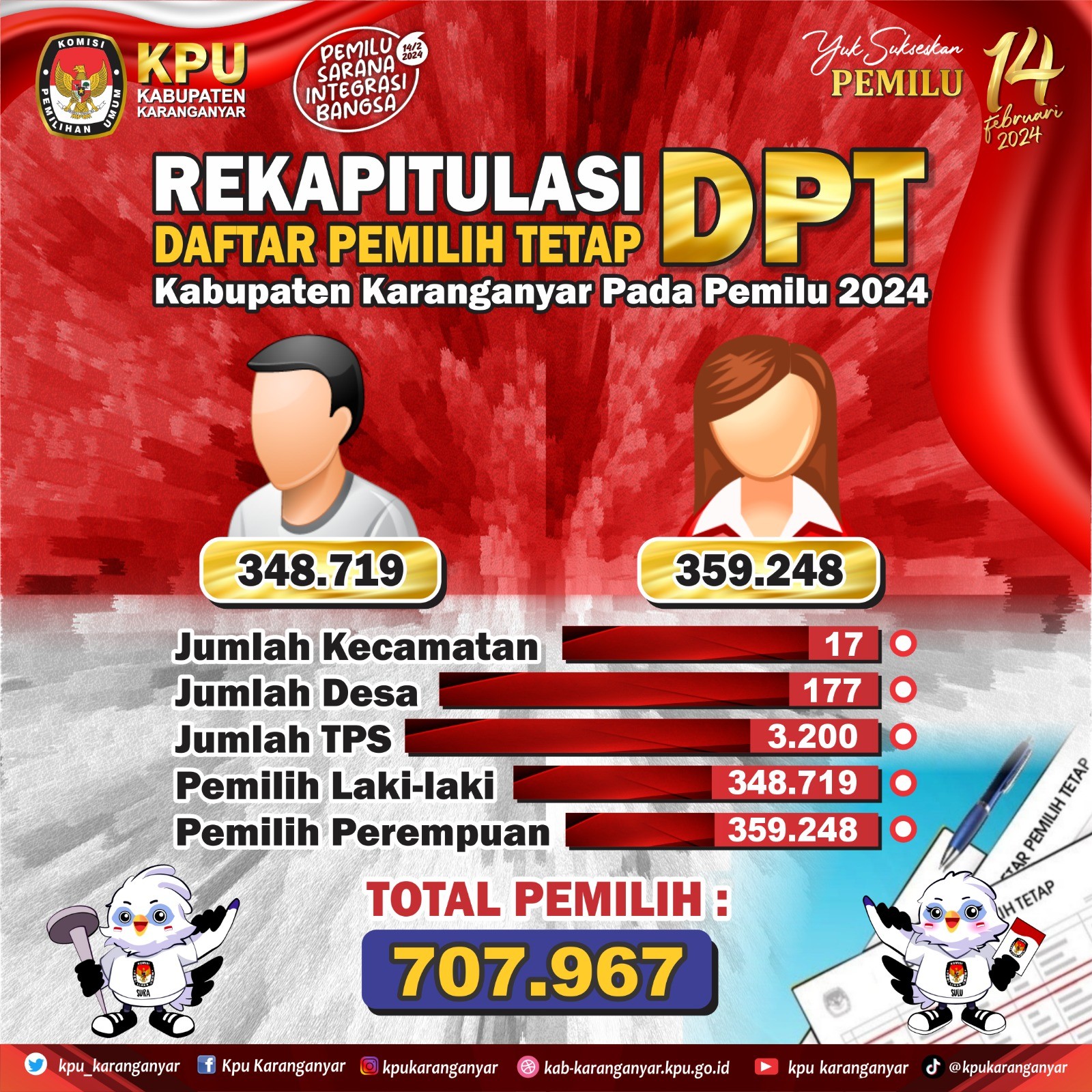 Banner infografis Daftar Pemilih Tetap (DPT) Kabupaten Karanganyar Pemilu Tahun 2024.