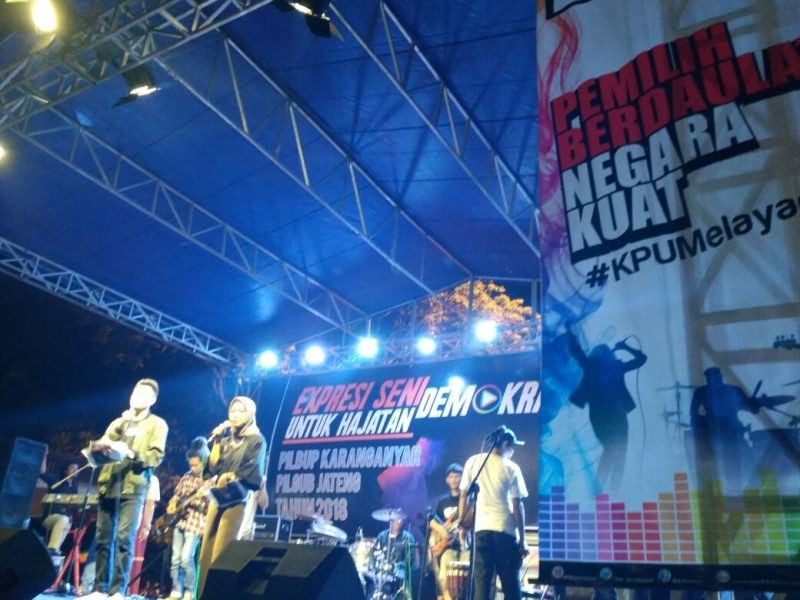 KARANGANYAR, kpu-karanganyarkab.go.id – Pada sabtu malam 24 Maret 2018 lalu, turut dalam keramaian yang telah merutinitas, KPU Kabupaten Karanganyar menggelar panggung seni di Plaza alun-alun Karanganyar. Dengan menggandeng band-band Karanganyar KPU mengajak masyarakat, khususnya pemuda dan pemilih pemula untuk menyukseskan hajatan demokrasi salah satunya melalui expresi seni.
