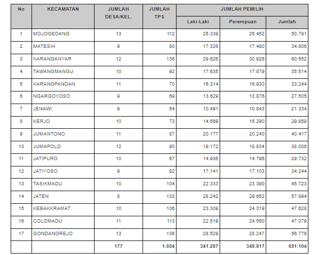 Sesuai aturan tersebut, KPU Kabupaten Karanganyar pada tanggal 10 April 2013 berdasarkan Berita Acara Nomor 516/BA/IV/2013 tentang Rekapitulasi DPT dan Jumlah TPS Pemilu Gubernur dan Wakil Gubernur Jawa Tengah Tahun 2013 sebanyak 691.104 pemilih dengan jumlah pemilih laki-laki 341.287 dan jumlah pemilih perempuan 349.817 orang yang tersebar di 1.604 Tempat Pemungutan Suara.