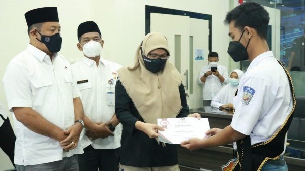 KARANGANYAR – Bupati Karanganyar, Juliyatmono secara simbolis memberikan slempang dalam pengukuhan Duta Sidatan (sistem informasi data pemilih berkelanjutan) KPU Karanganyar, Rabu, (25/08/2021) kemarin. Puluhan siswa dari sejumlah SMA/SMK/MA se-Karanganyar dikukuhkan menjadi Duta Sidatan KPU Karanganyar secara serentak dengan pemberian Pin dan sertifikat yang ditandatangani Ketua KPU Karanganyar.