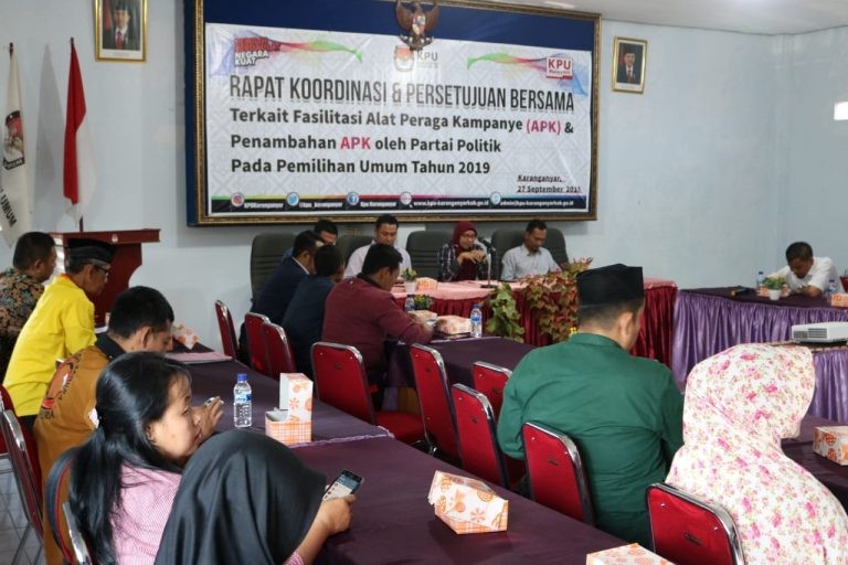 KARANGANYAR, kpu-karanganyarkab.go.id – KPU Karanganyar dalam pelaksanaan Pemilu tahun 2019 akan memfasilitasi pengadaan Alat Peraga Kampanye bagi Peserta Pemilu. Pada tanggal 27 September 2018 KPU karanganyar mengundang Bawaslu Kabupaten Karanganyar, Tim Kampanye Pasangan Calon Presiden dan Wakil Presiden dan Partai Politik Peserta Pemilu Tahun 2019 tingkat Kabupaten Karanganyar untuk membicarakan dan menyepakati ukuran Alat Peraga Kampanye yang akan difasilitasi oleh KPU Karanganyar.