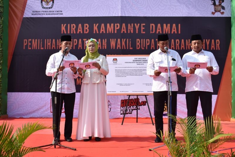 Kegiatan yang dihadiri oleh Forkopimda, Panwaskab, dan Paslon beserta sekurang-kurangnya 250 anggota tim pendukung turut memeriahkan dan memadati alun-alun Karanganyar. Deklarasi kampanye damai dimulai dengan menyanyikan lagu kebangsaan Indonesia Raya, dilanjutkan dengan orasi demokrasi dari Forkopimda, Panwaskab, dan KPU.