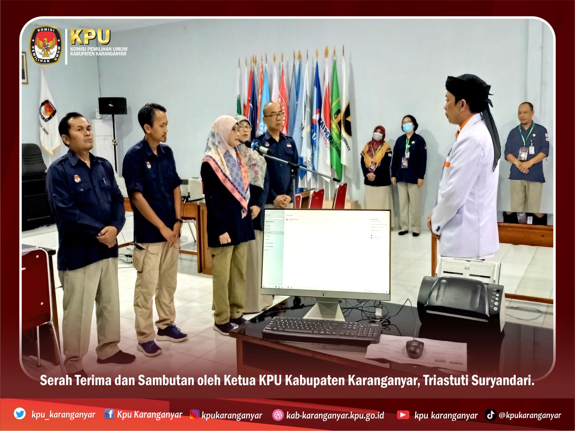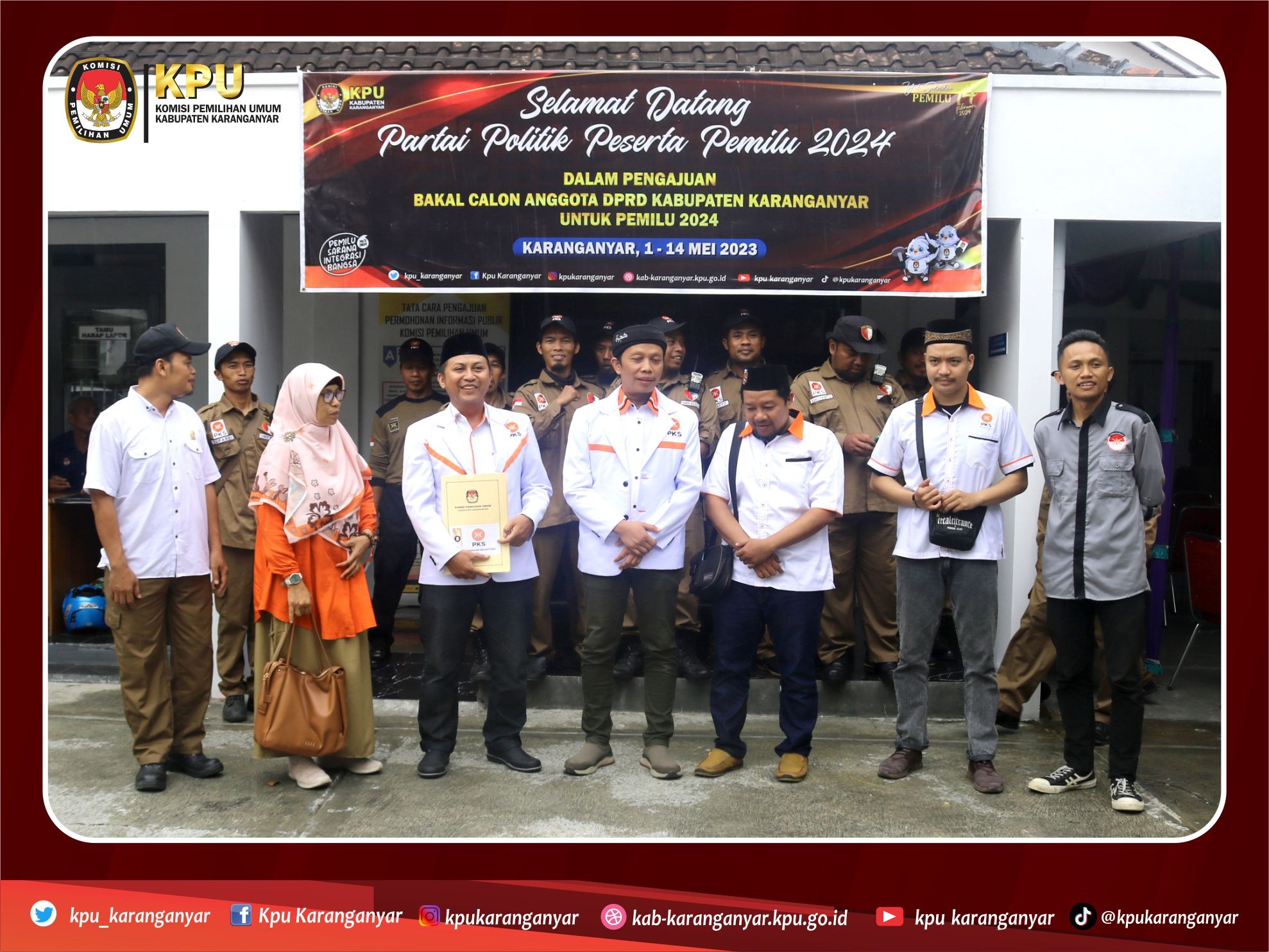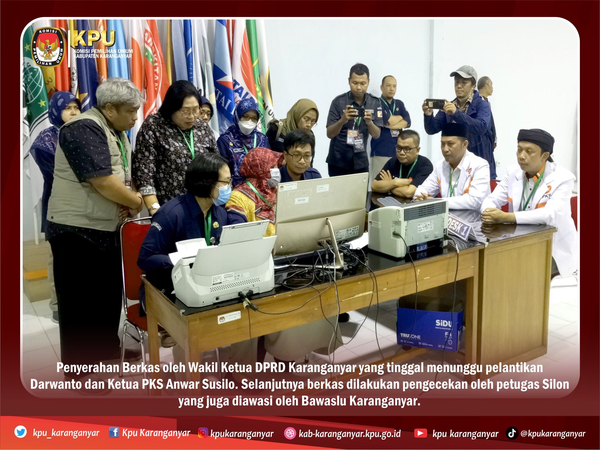 Rombongan dari DPD PKS Karanganyar diterima Ketua KPUD Karanganyar Triastuti Suryandari berserta komisioner lainnya. Kali ini DPD PKS Karanganyar mendaftarkan Bacaleg sebanyak 45 orang.