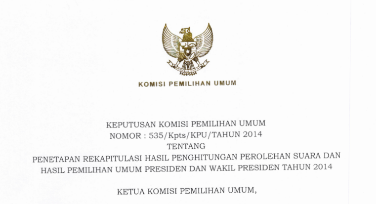Keputusan Komisi Pemilihan Umum (KPU) Nomor: 535/Kpts/KPU/Tahun 2014 tentang Penetapan Rekapitulasi Hasil Penghitungan Perolehan Suara dan Hasil Pemilihan Umum Presiden dan Wakil Presiden Tahun 2014