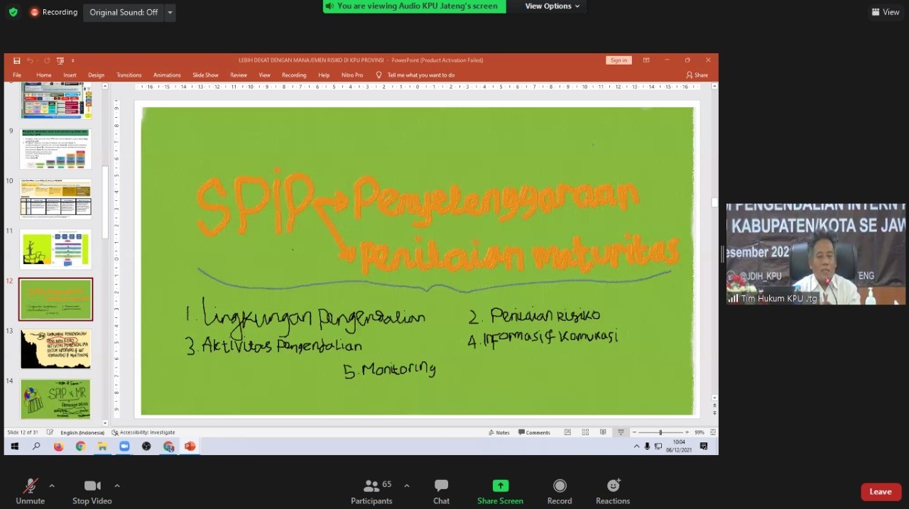 “Ada beberapa unsur yang terdapat dalam SPIP yaitu pengendalian dan pelaporan kartu kendali. Untuk memetakan resiko, mengurangi atau menghindari resiko, diperlukan target sehingga mampu mengidentifikasi, menentukan, menetapkan serta mengambil langkah-langkah dalam meminimalkan resiko, “ ujar Muslim sebagai pemantik diskusi kegiatan Webinar Bimbingan Teknis Penilaian dan Pengendalian Risiko Sistem Pelaporan Intern Pemerintah (SPIP) yang diselenggarakan oleh KPU Provinsi Jawa Tengah secara daring melalui zoom meeting, Senin (6/12/2021).