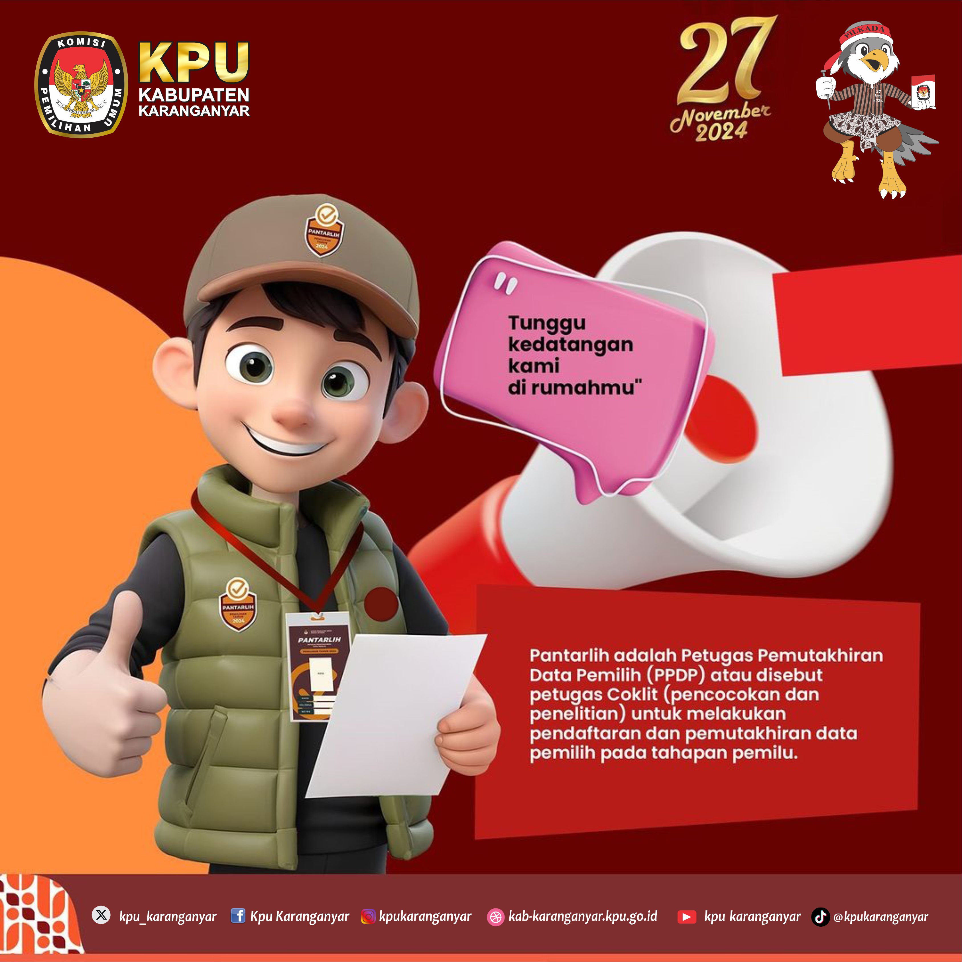 Jangan lupa Coklit itu dimulai 24 Juni 2024 sampai 24 Juli 2024. Pastiin kamu udah terdata supaya bisa ikutan nyoblos di 27 November 2024 untuk milih Gubernur-Wakil Gubernur Jawa Tengah dan Bupati-Wakil Bupati Karanganyar. Eiitt... jangan lupa siapin KTP dan Kartu Keluarga ya.