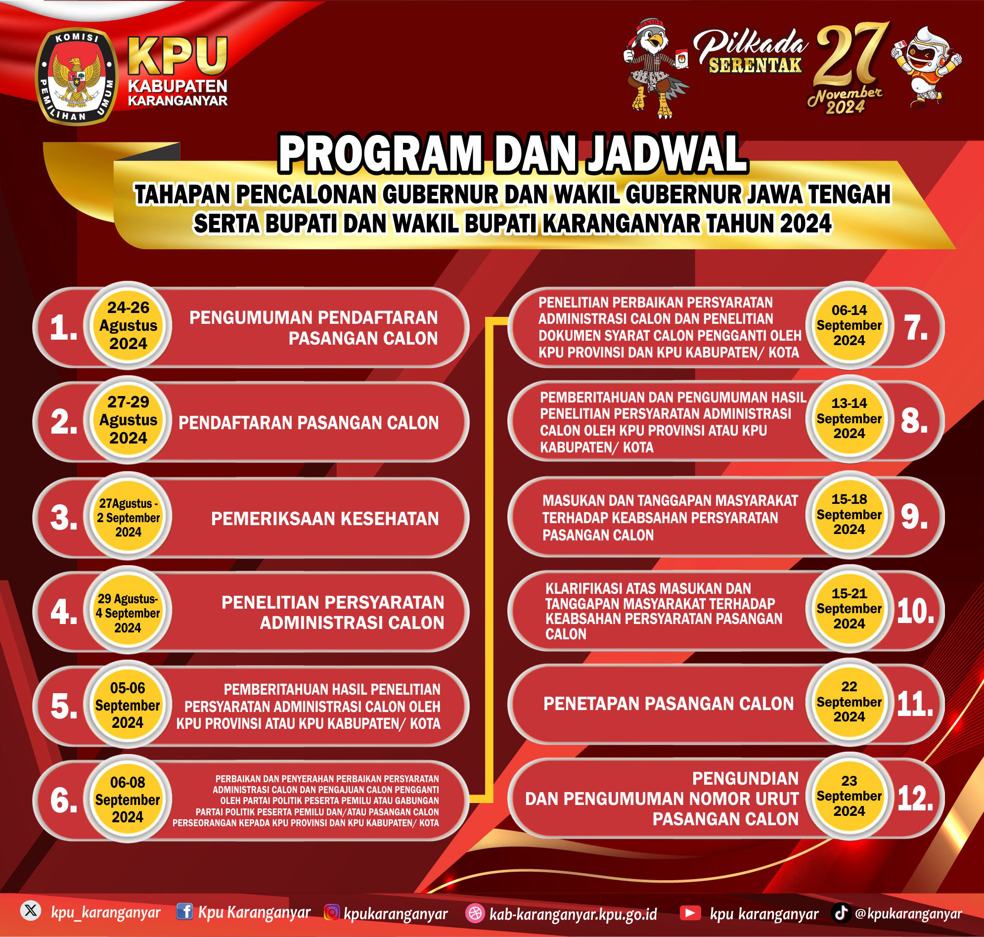 Berikut kami sampaikan infografis Program dan Jadwal Tahapan Pencalonan Gubernur dan Wakil Gubernur, serta Bupati dan Wakil Bupati Karanganyar Tahun 2024.