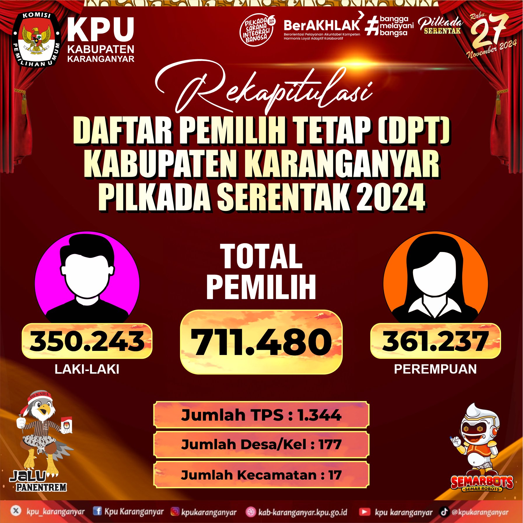 Berikut Rekapitulasi Daftar Pemilih Tetap (DPT) Kabupaten Karanganyar pada Pilkada Serentak Tahun 2024. Pemilih laki-laki sejumlah 350.243 dan perempuan sejumlah 361.237. Total pemilih sejumlah 711.480.