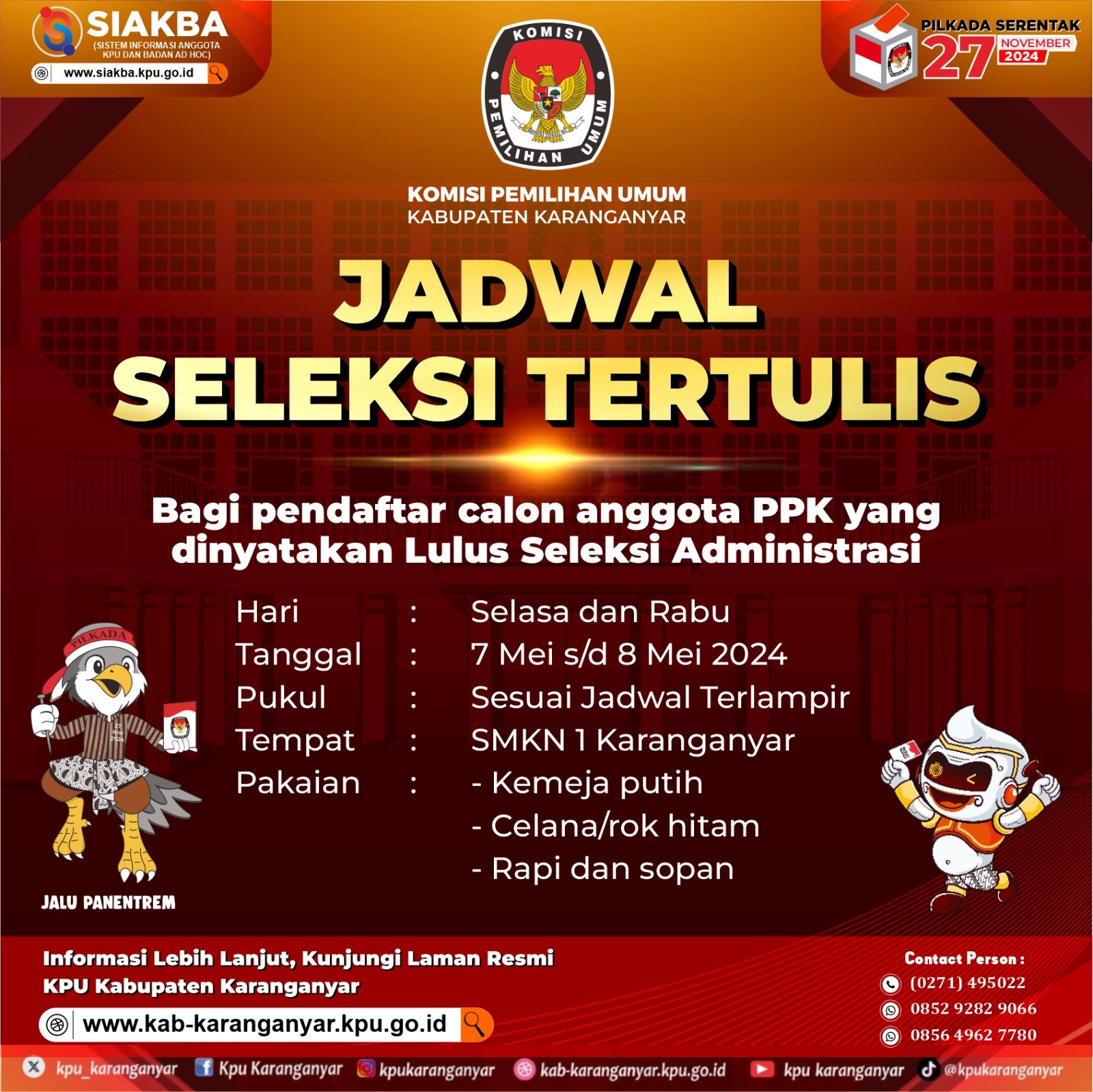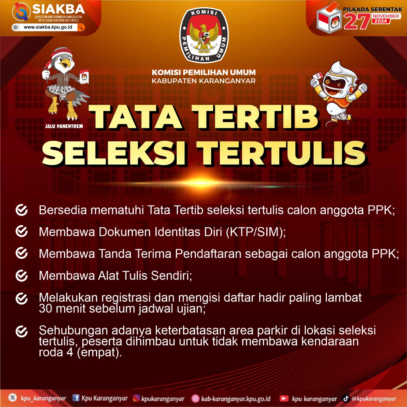 Pendaftaran dan Seleksi Administrasi Badan Adhoc PPK telah usai. Selanjutnya cek yuuk Jadwal Pelaksanaan Seleksi Tertulis PPK beserta Tata Tertib-nya. Jangan lupa ya dan catat tanggalnya...
