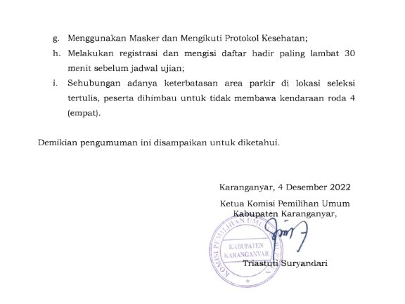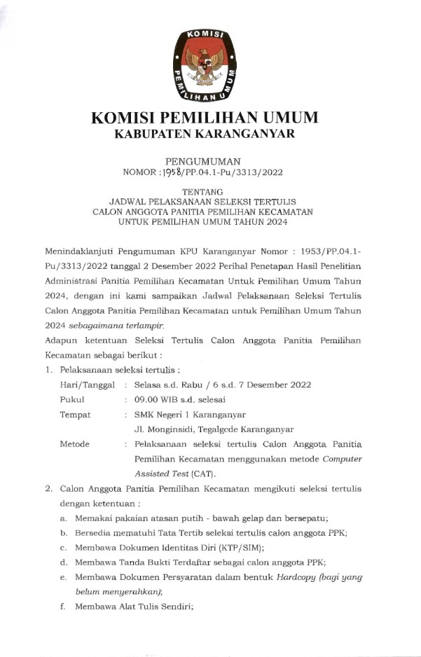 JADWAL PELAKSANAAN SELEKSI TERTULIS CALON ANGGOTA PANITIA PEMILIHAN KECAMATAN UNTUK PEMILU 2024 Minggu, 04 Desember 2022 00:00 182 DOWNLOAD PDF JADWAL SELEKSI TERTULIS [DI SINI] Bagikan: Telah dilihat 182 kali