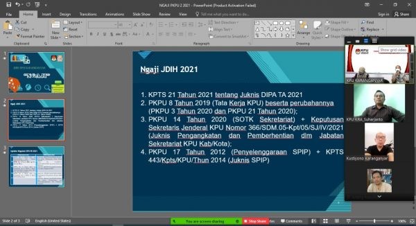 Ketua KPU Karanganyar, Triastuti Suryandari dalam sambutannya menyampaikan bahwa di bulan Juli, ada 4 (empat) regulasi terbaru yang diterbitkan oleh KPU RI. “Dibulan ini, JDIH KPU RI telah merilis 4 (empat) Peraturan KPU Tahun 2021, salah satunya adalah Peraturan KPU Nomor 2 Tahun 2021. Regulasi mengenai Tata Naskah Dinas didahulukan untuk dikaji karena berkaitan dengan ketentuan administrasi layanan perkantoran yaitu pengaturan tentang jenis, susunan dan bentuk, pembuatan, pengamanan, pejabat penandatanganan, dan pengendalian yang digunakan dalam komunikasi kedinasan, “ujar Trias.