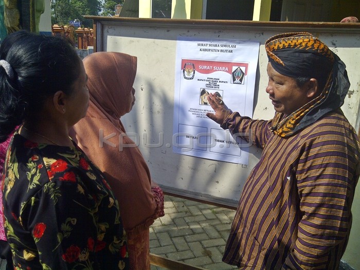 Hal tersebut disampaikannya saat sedang menerangkan contoh surat suara kepada warga pada kegiatan simulasi pemungutan suara dengan satu pasangan calon, di Desa Pagarwejo,Kab Kecamatan Kesamben, Kabupaten Blitar, Minggu (22/11). (dam/red. FOTO KPU/dam/Hupmas)