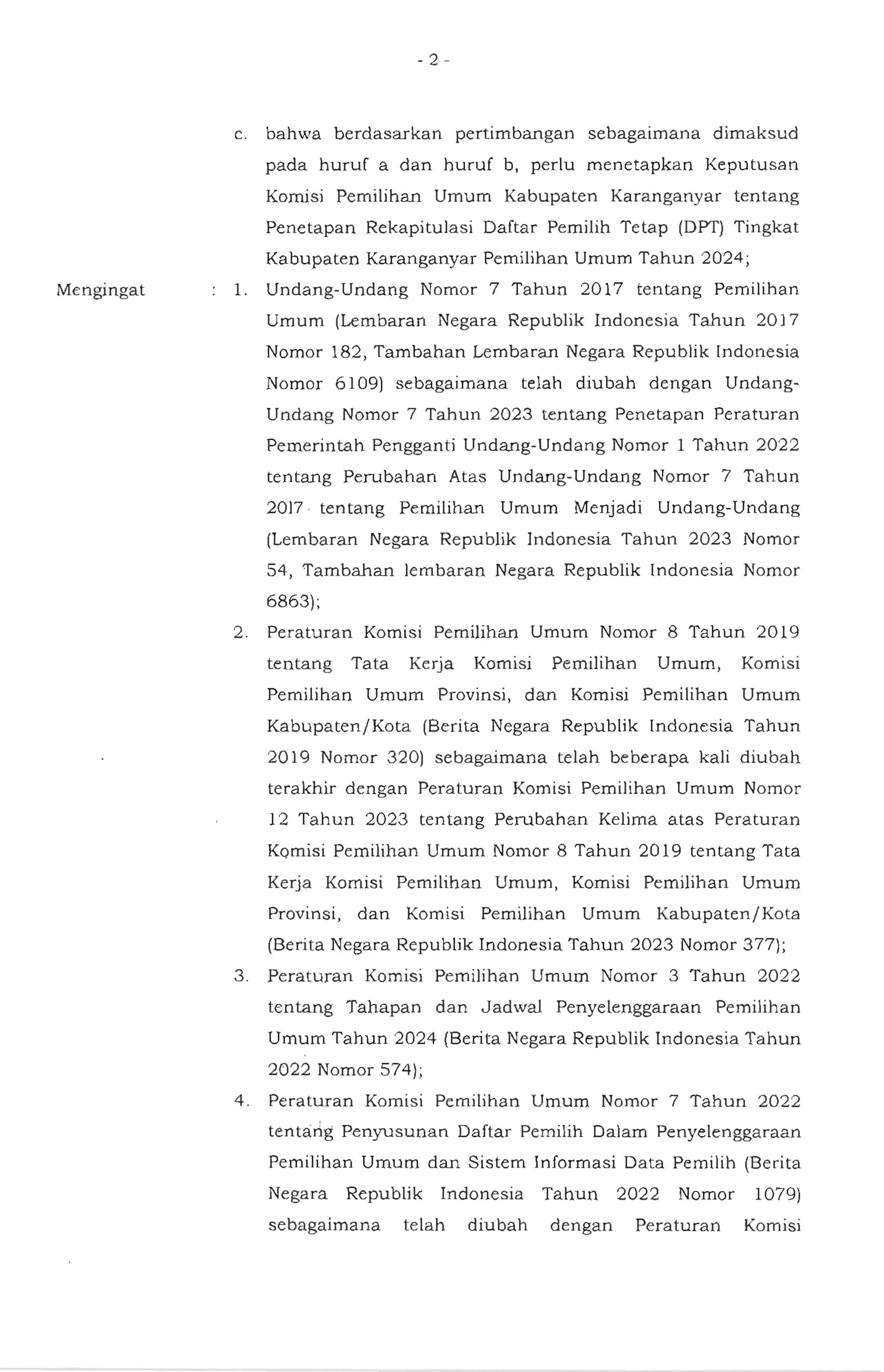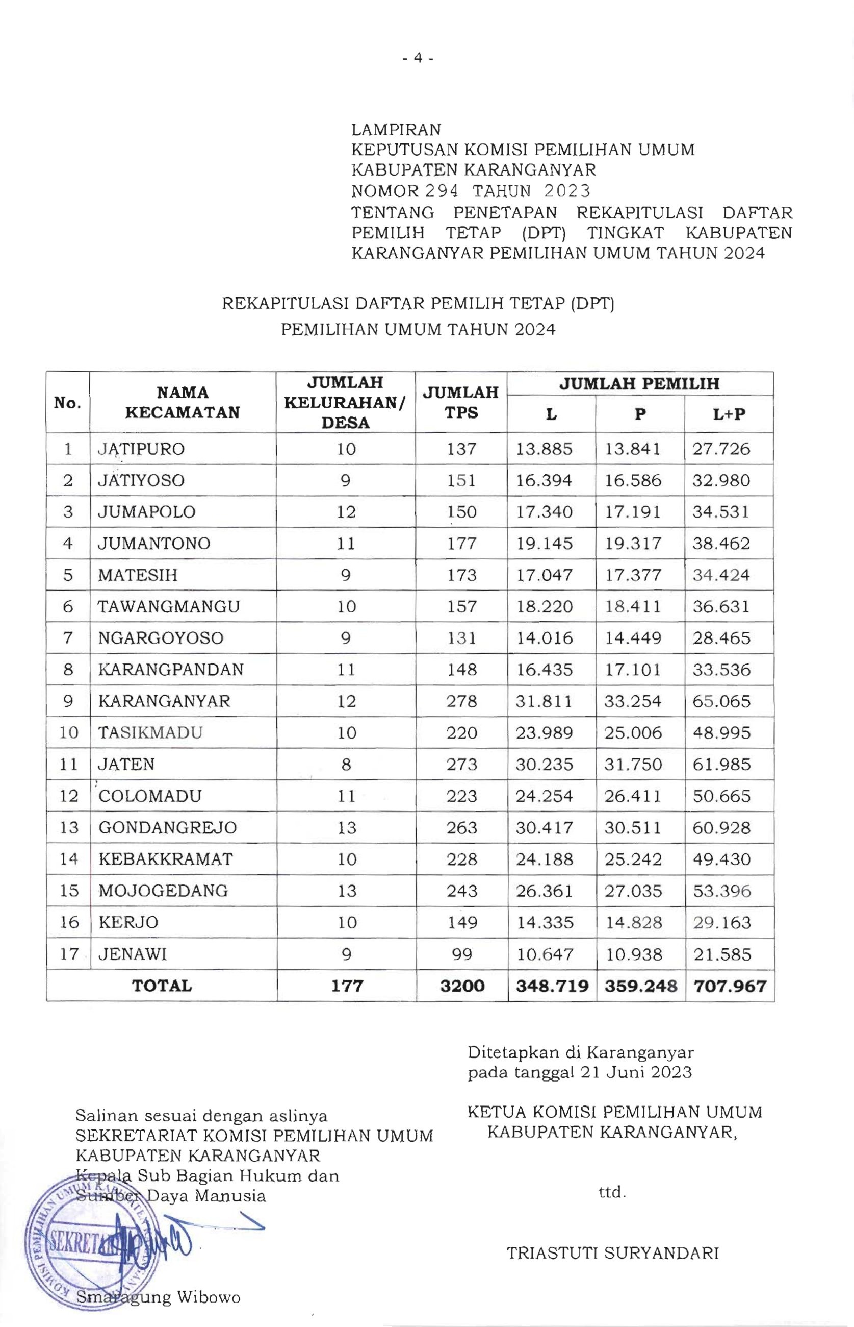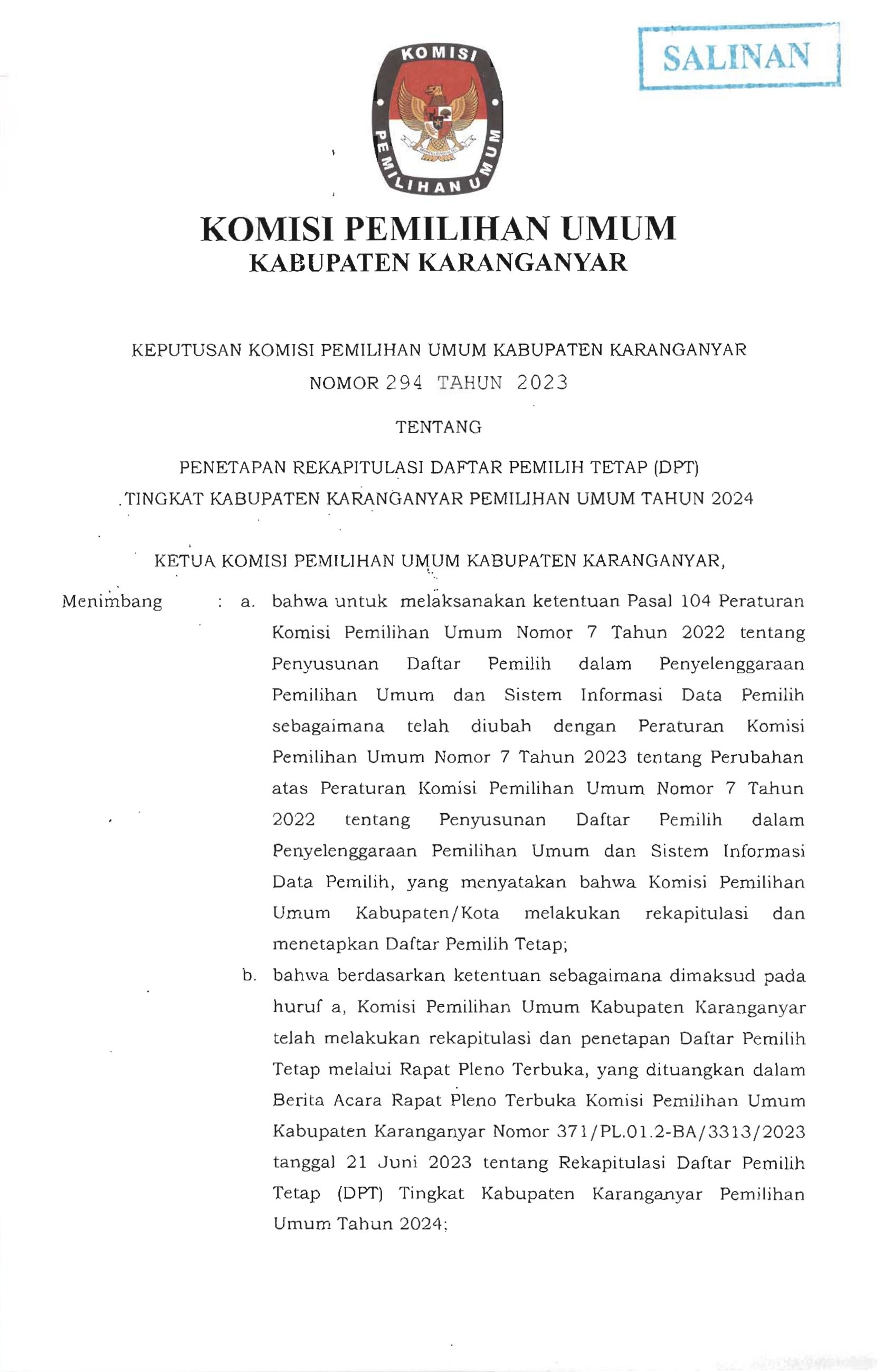 KEPUTUSAN KPU KABUPATEN KARANGANYAR NOMOR 294 TAHUN 2023 TENTANG PENETAPAN REKAPITULASI DPT PEMILU 2024 Kamis, 22 Juni 2023 14:30 160 DOWNLOAD PDF DOWNLOAD MODEL A.KAB/KO DAFTAR PEMILIH Bagikan: Telah dilihat 160 kali
