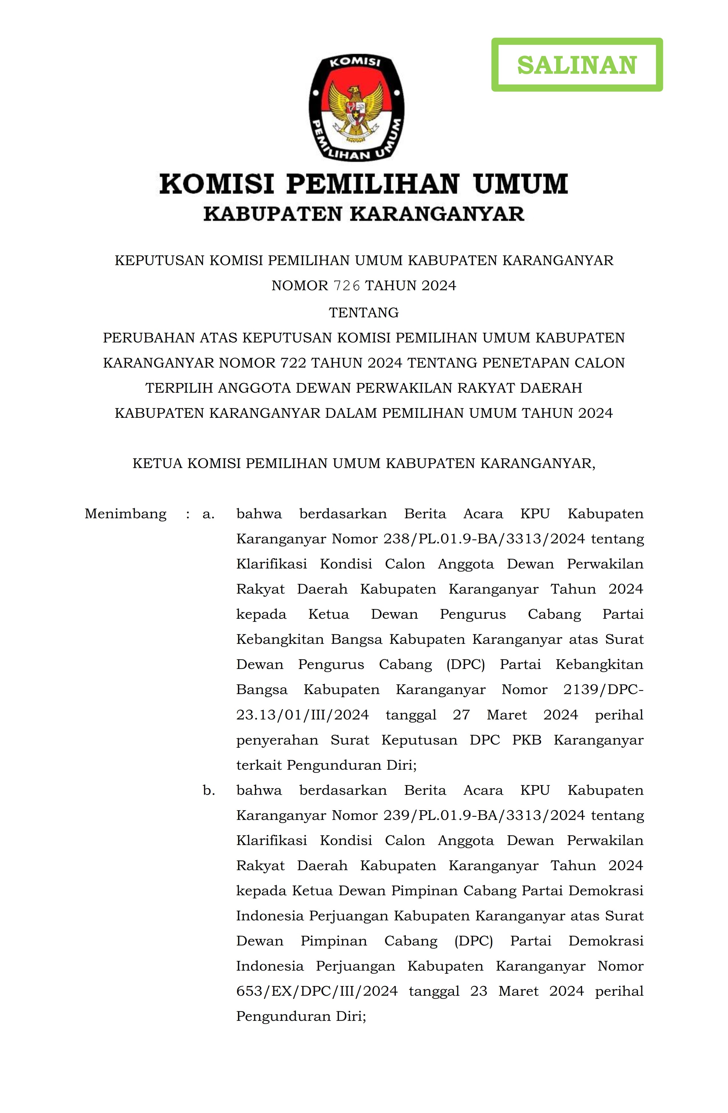 KEPUTUSAN KPU KARANGANYAR NO. 726 TAHUN 2024 TENTANG PERUBAHAN ATAS KEPUTUSAN KPU KARANGANYAR NOMOR 722 TAHUN 2024... Sabtu, 11 Mei 2024 07:00 73 DOWNLOAD PENGUMUMAN KEPUTUSAN KOMISI PEMILIHAN UMUM KABUPATEN KARANGANYAR NOMOR 726 TAHUN 2024 TENTANG PERUBAHAN ATAS KEPUTUSAN KOMISI PEMILIHAN UMUM KABUPATEN KARANGANYAR NOMOR 722 TAHUN 2024 TENTANG PENETAPAN CALON TERPILIH ANGGOTA DEWAN PERWAKILAN RAKYAT DAERAH KABUPATEN KARANGANYAR DALAM PEMILIHAN UMUM TAHUN 2024. Selengkapnya dapat Anda DOWNLOAD DISINI Bagikan: Telah dilihat 73 kali