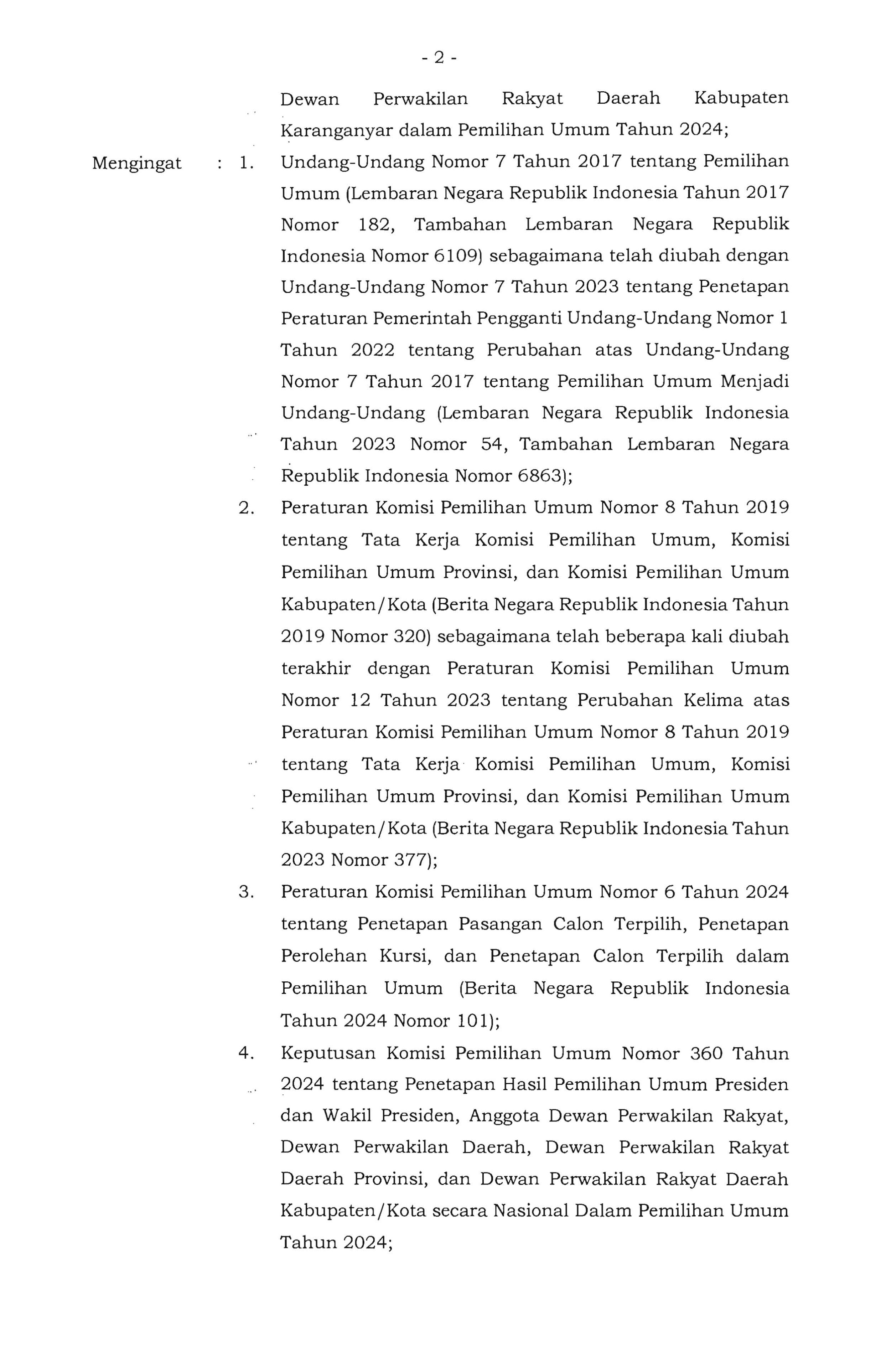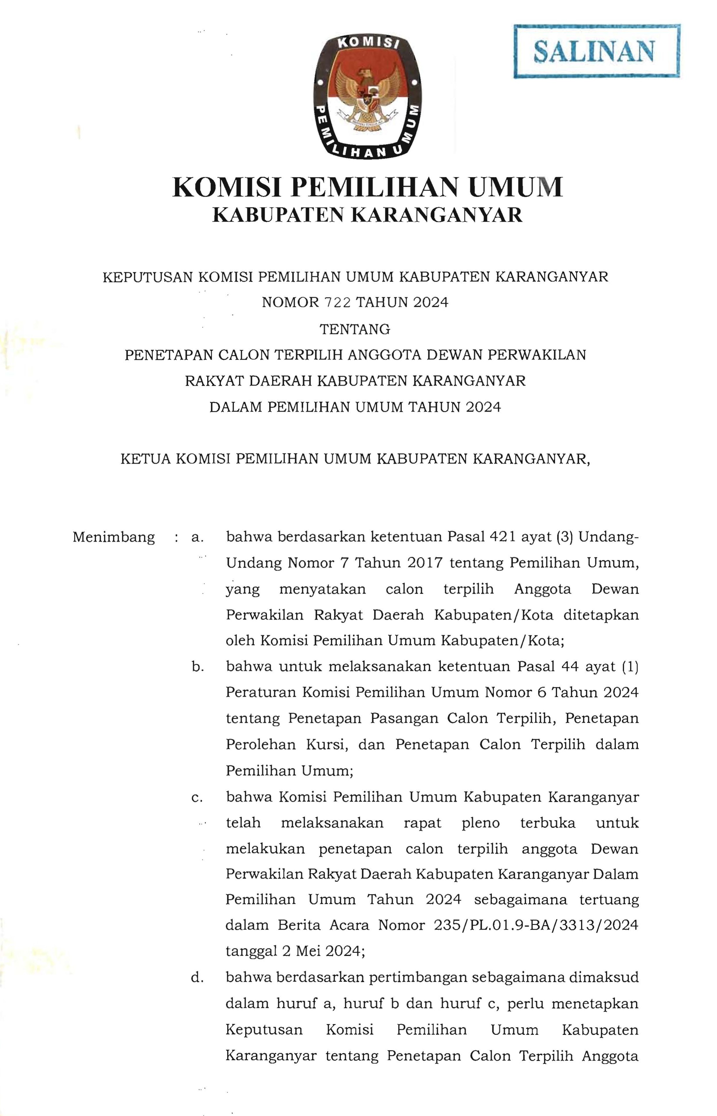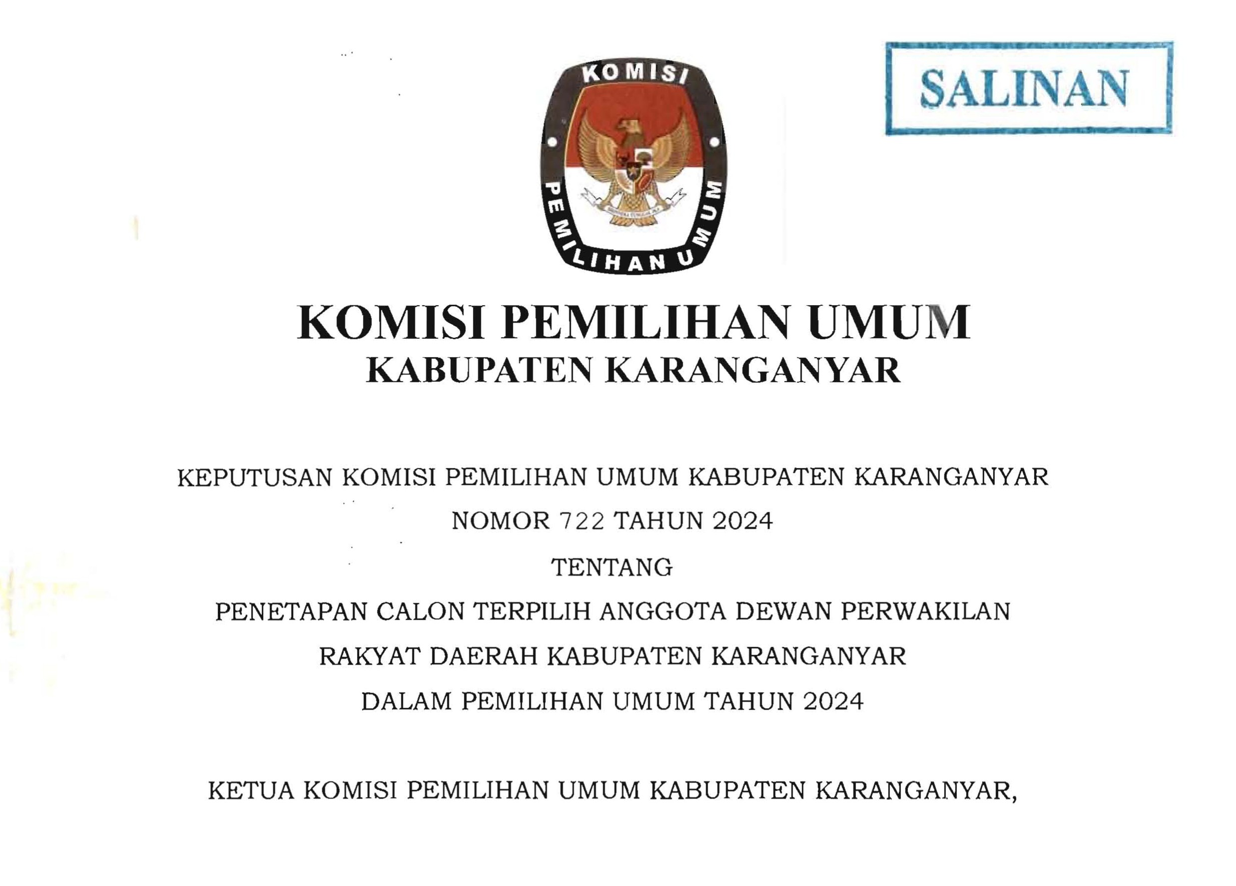 KEPUTUSAN KPU KARANGANYAR NO.722 TH. 2024 TENTANG PENETAPAN CALON TERPILIH ANGGOTA DPRD KAB. KARANGANYAR DALAM PEMILU 2024