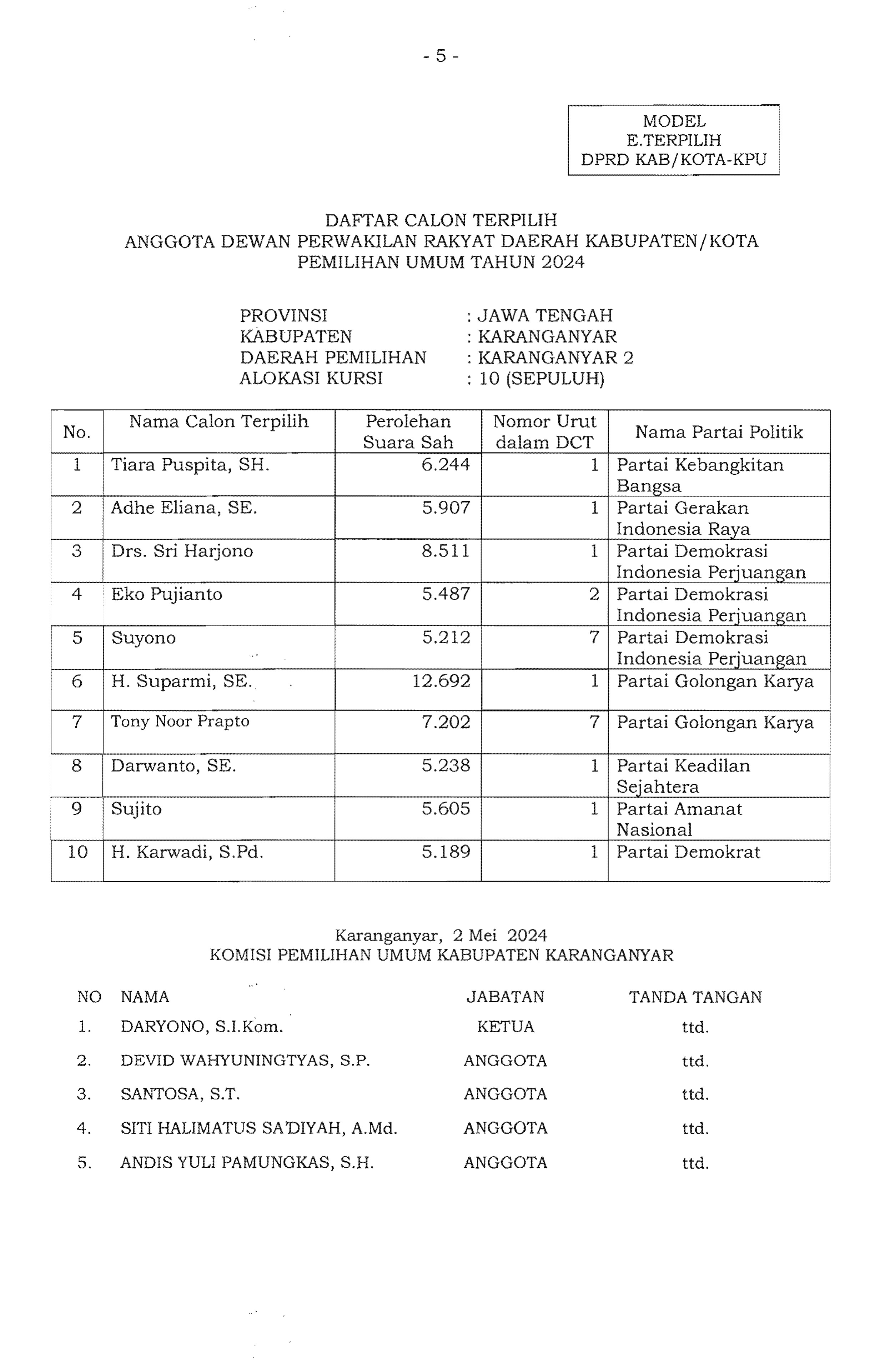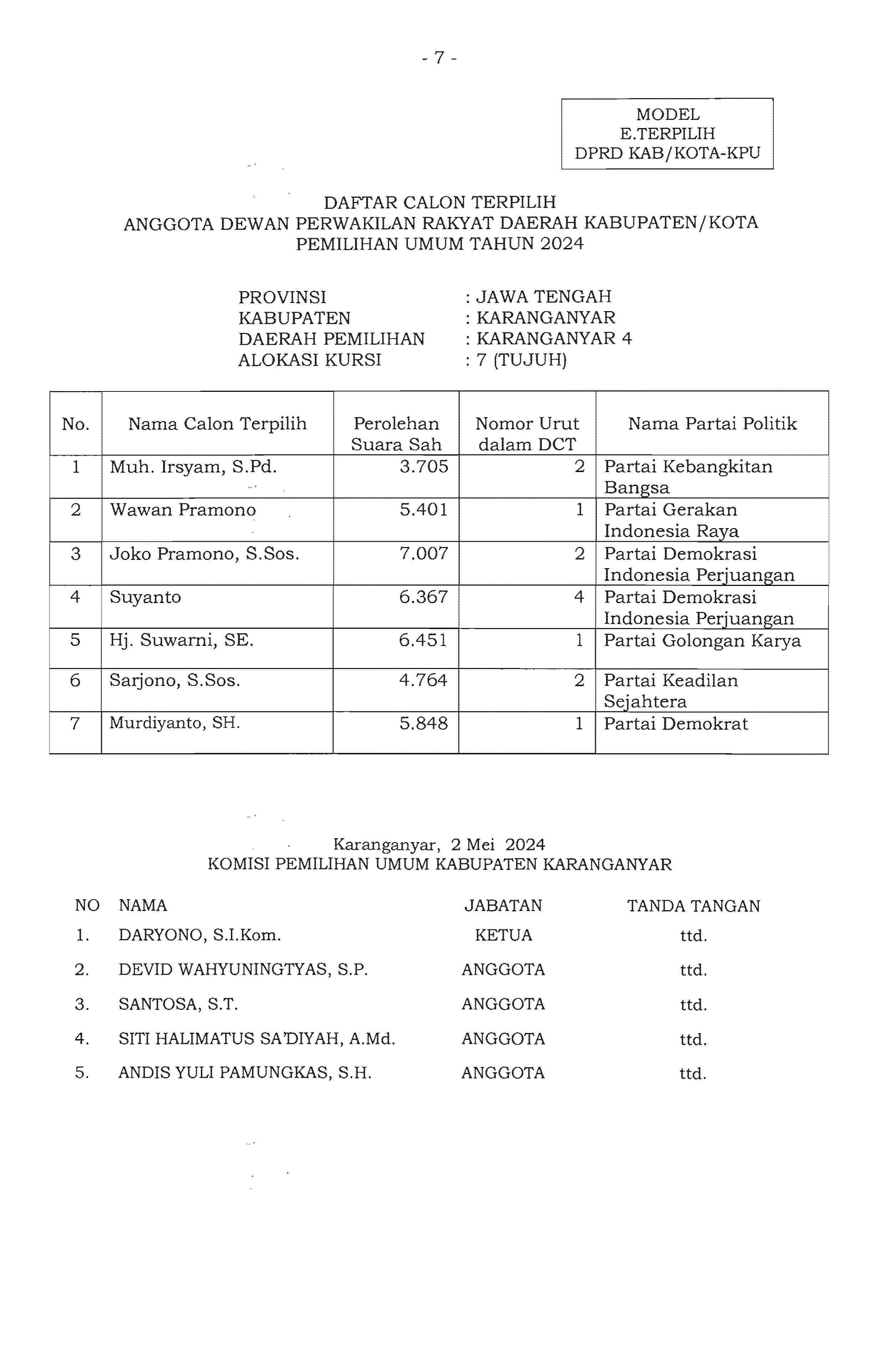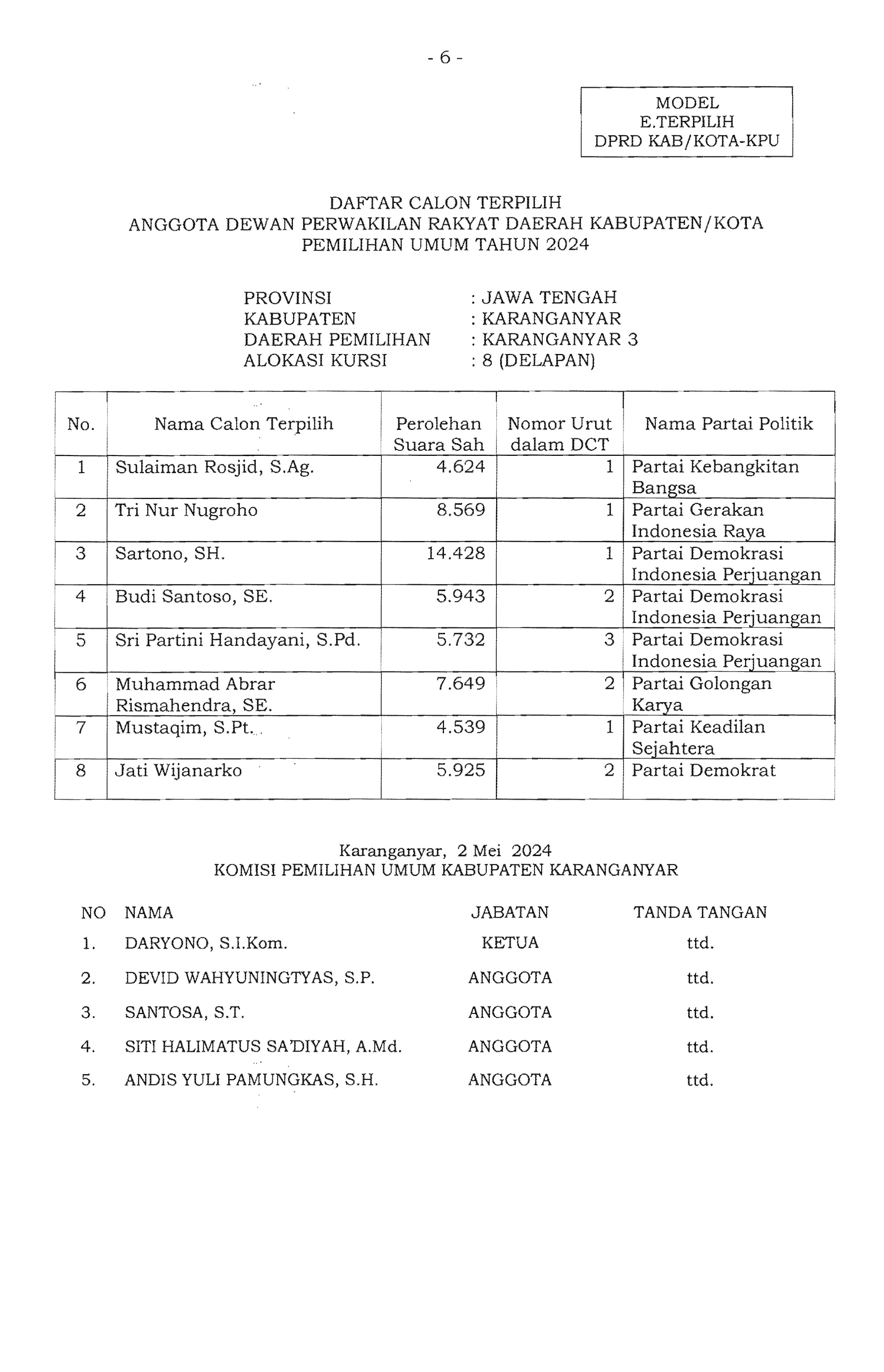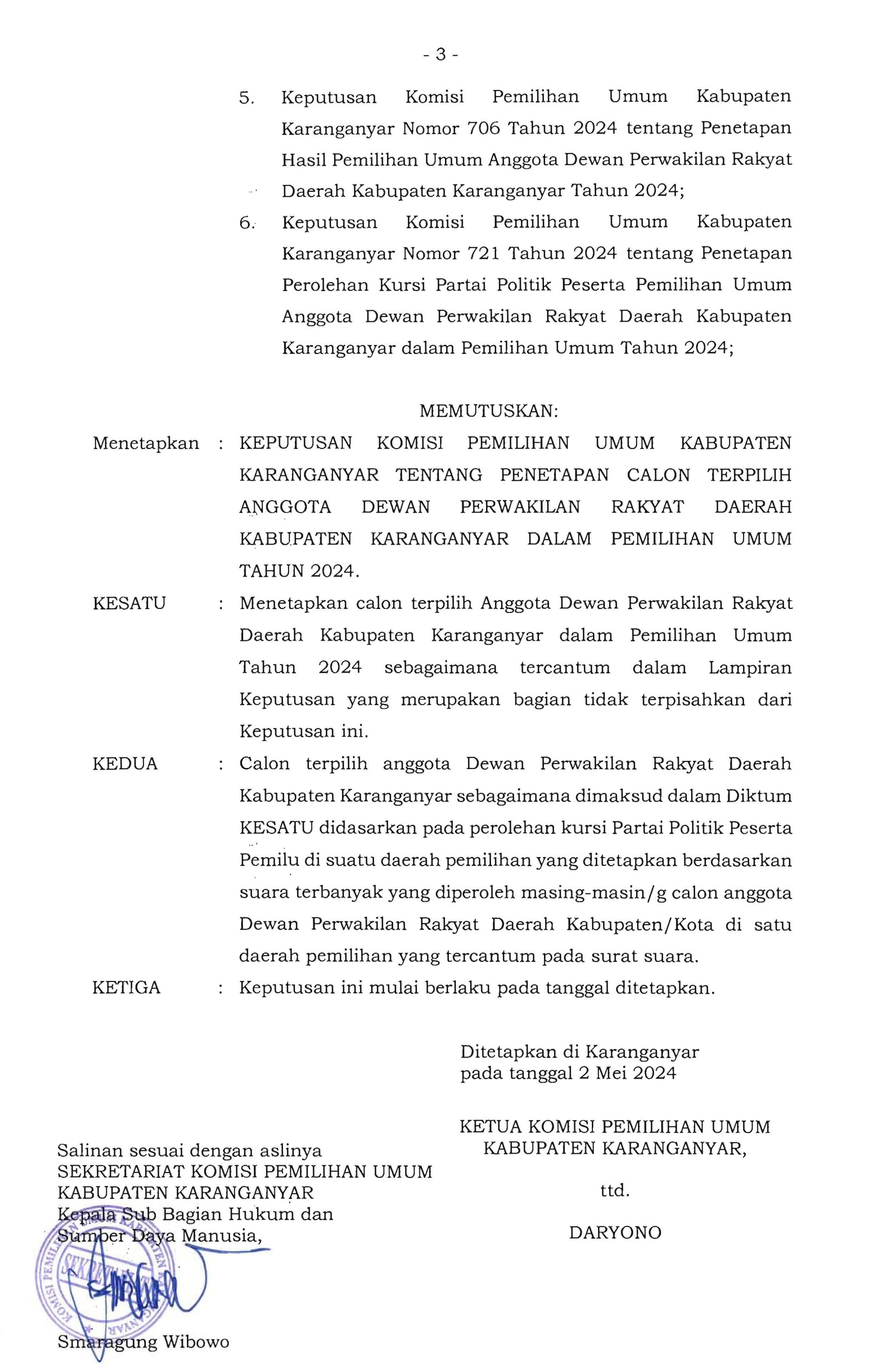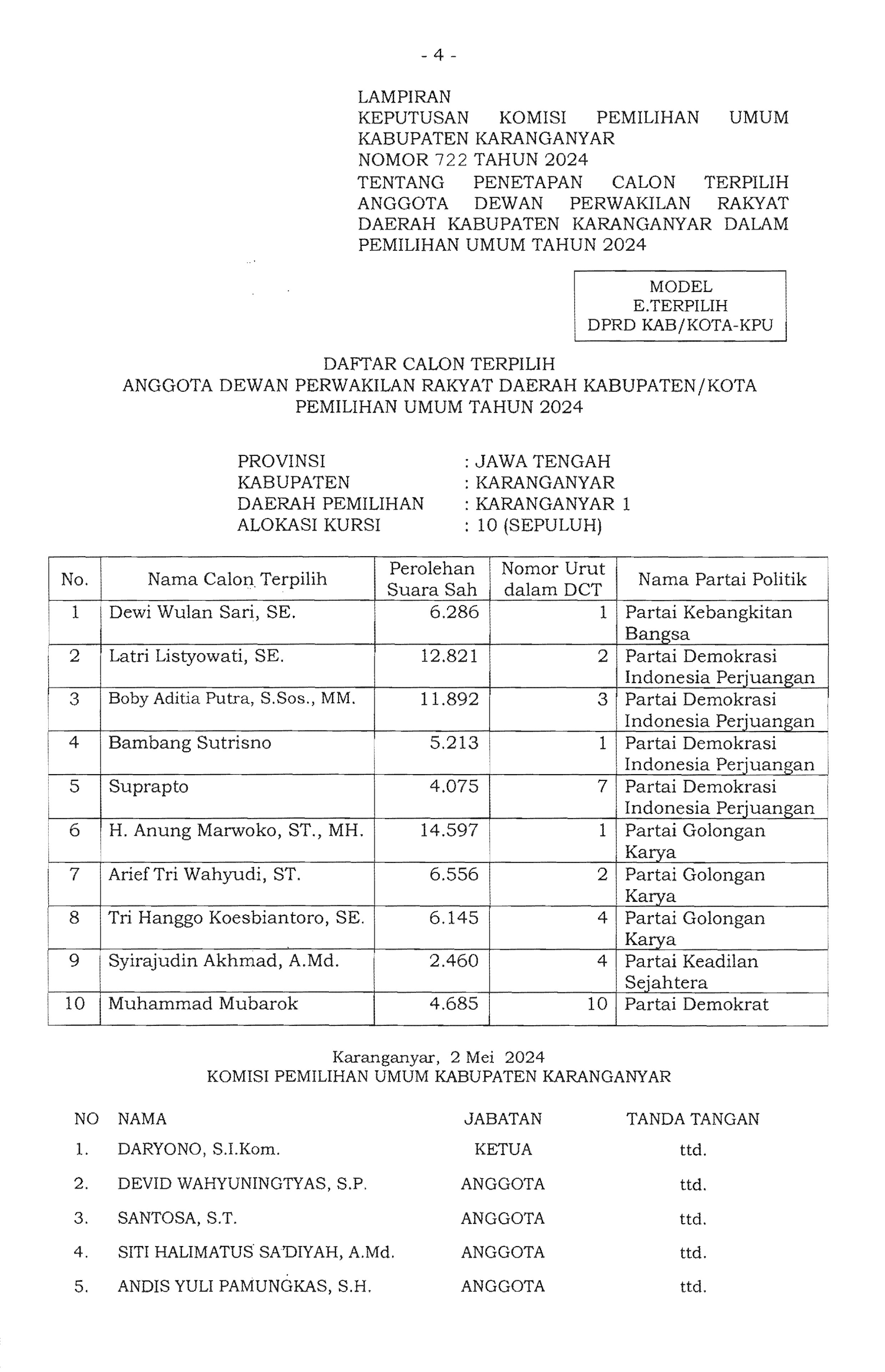 KEPUTUSAN KOMISI PEMILIHAN UMUM KABUPATEN KARANGANYAR NOMOR 722 TAHUN 2024 TENTANG PENETAPAN CALON TERPILIH ANGGOTA DEWAN PERWAKILAN RAKYAT DAERAH KABUPATEN KARANGANYAR DALAM PEMILIHAN UMUM TAHUN 2024.
