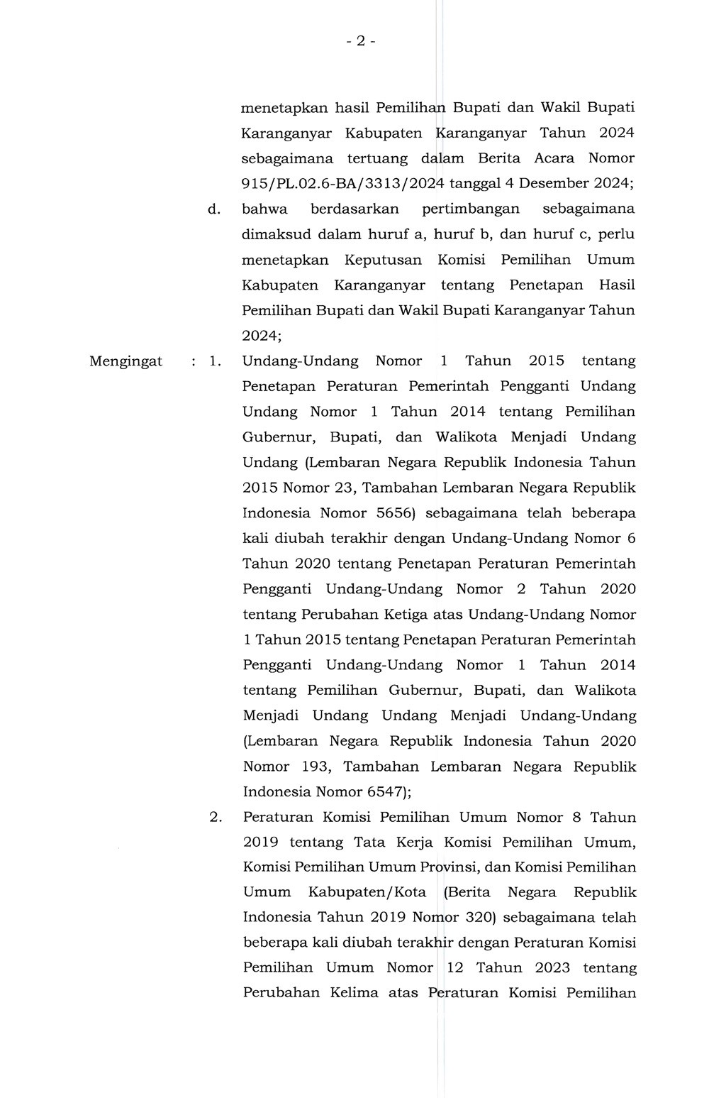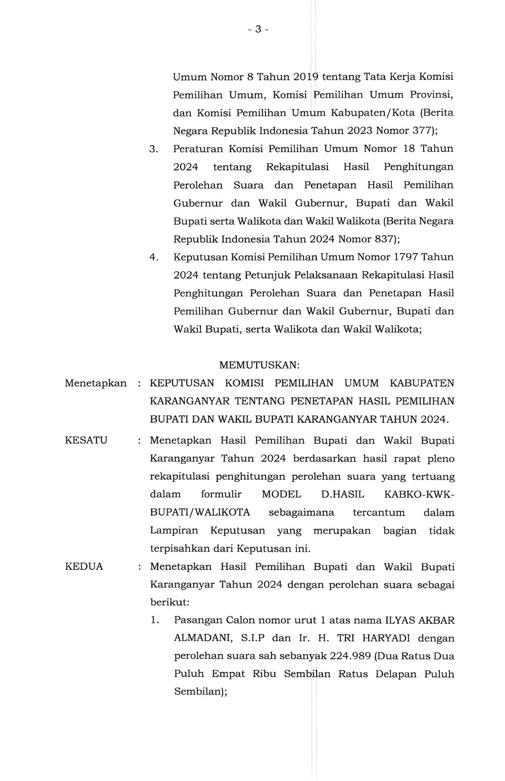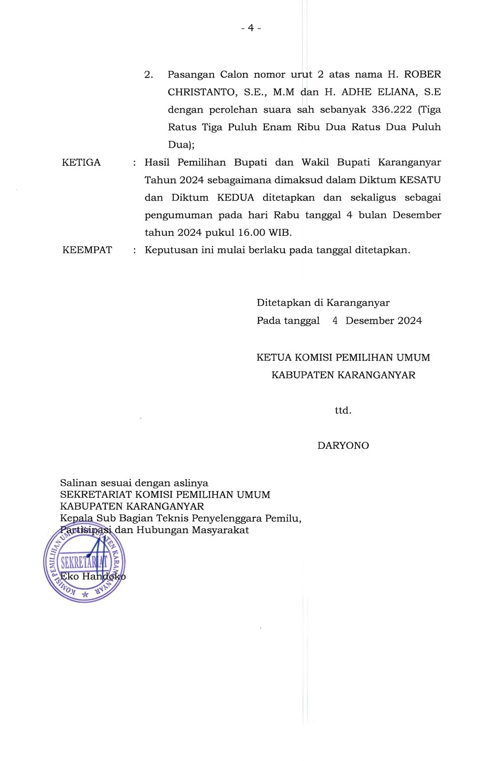 Keputusan KPU Karanganyar Nomor 1945 Tahun 2024 Tentang Penetapan Hasil Pemilihan Bupati dan Wakil Bupati Karanganyar Tahun 2024 Rabu, 04 Desember 2024 17:00 1122 DOWNLOAD KEPUTUSAN Bagikan: Telah dilihat 1,122 kali