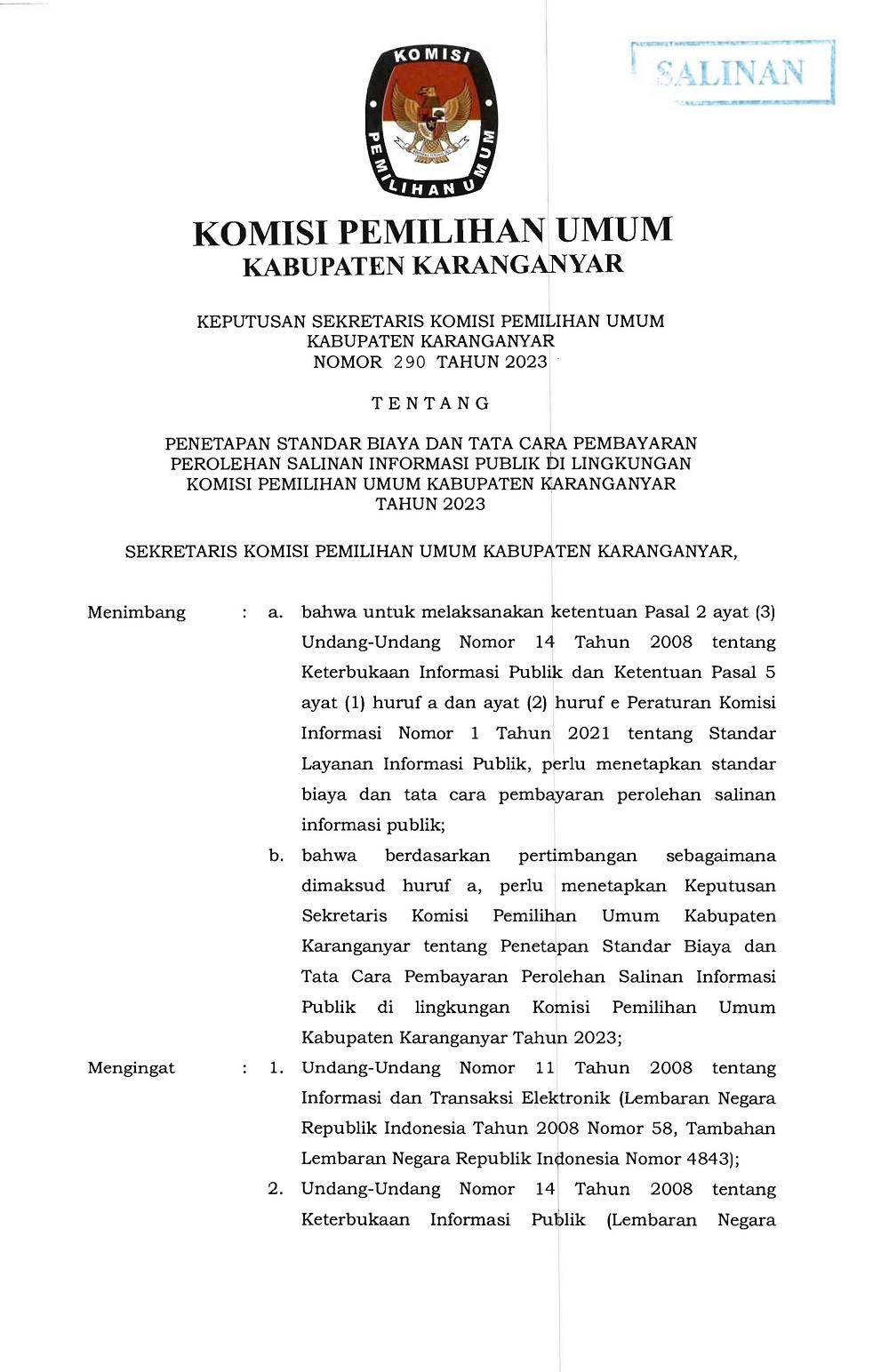 KEPUTUSAN KPU KARANGANYAR TENTANG PENETAPAN STANDAR BIAYA DAN TATA CARA PEMBAYARAN PEROLEHAN SALINAN INFORMASI PUBLIK Jumat, 12 Mei 2023 20:00 49 DOWNLOAD KEPUTUSAN Bagikan: Telah dilihat 49 kali