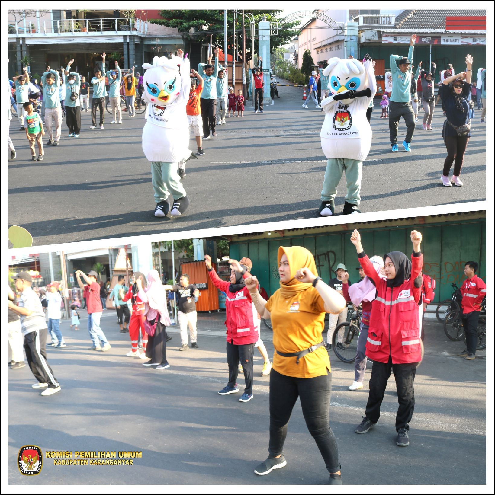 Sosialisasi pendidikan pemilih menyasar masyarakat Karanganyar yang sedang berolah raga di Kawasan CFD, dengan memperkenalkan maskot sura sulu sebagai Maskot Pemilu tahun 2024.