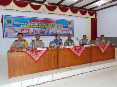 Purwokerto, kpu.go.id Ketua Komisi Pemilihan Umum (KPU) Kabupaten Banyumas, Unggul Warsiadi, SH, MH beserta Komisioner Waslam Makhsid, SH, MH dan Suharso Agung Basuki, SH, MH menghadiri Rapat Koordinasi Kesiapan Pengamanan Pelaksanaan Pilkada Serentak Tahap I 9 Desember 2015 yang diselenggarakan oleh Badan Koordinasi Wilayah (Bakorwil) III Pemerintah Provinsi Jawa Tengah, Selasa (27/10).