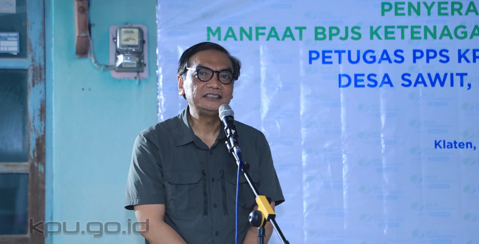 Turut mendampingi, Anggota KPU Provinsi Jawa Tengah Paulus Widiyantoro, Ketua, Anggota dan Sekretaris KPU Kab. Klaten, KA Kanwil Jateng DIY BPJS Ketenagakerjaan Isna Vodiar Jatmiko, perwakilan Pemda Klaten, PPK dan PPS. (humas kpu ri tenri/foto tenri/ed diR)