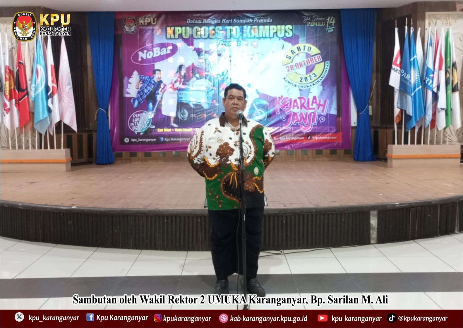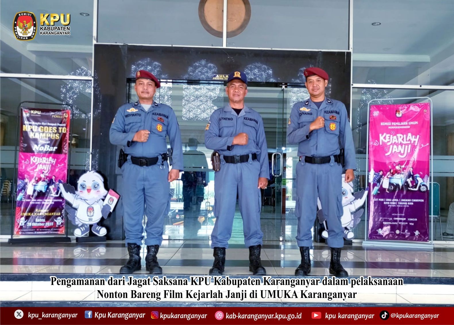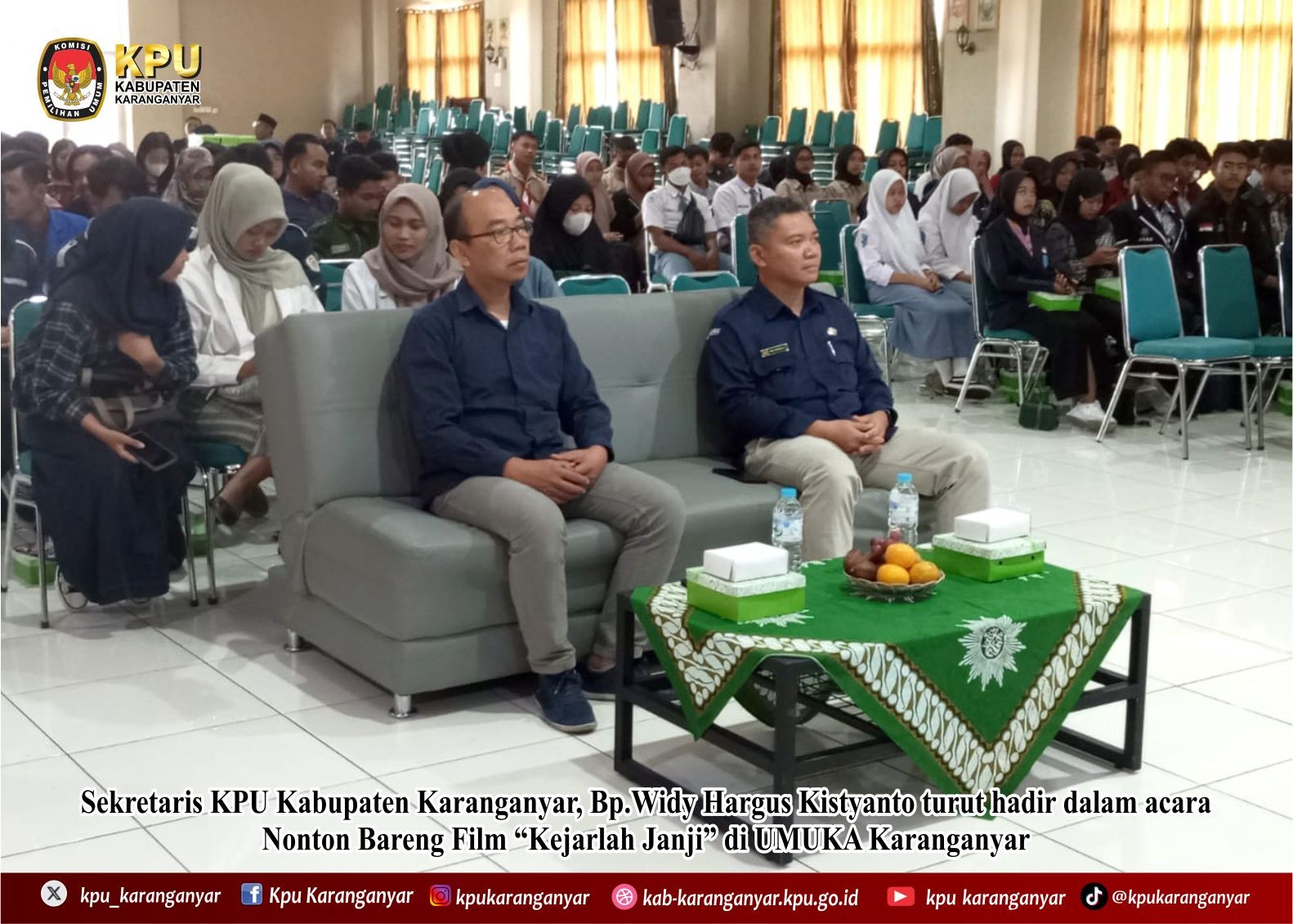 Dalam rangka memperingati Hari Sumpah Pemuda Tahun 2023, KPU Kabupaten Karanganyar menyelenggarakan KPU Goes To Kampus, Nonton Bareng (NoBar) Film "Kejarlah Janji" di Kampus Universitas Muhammadiyah Karanganyar (UMUKA) pada Sabtu (28/10/2023).