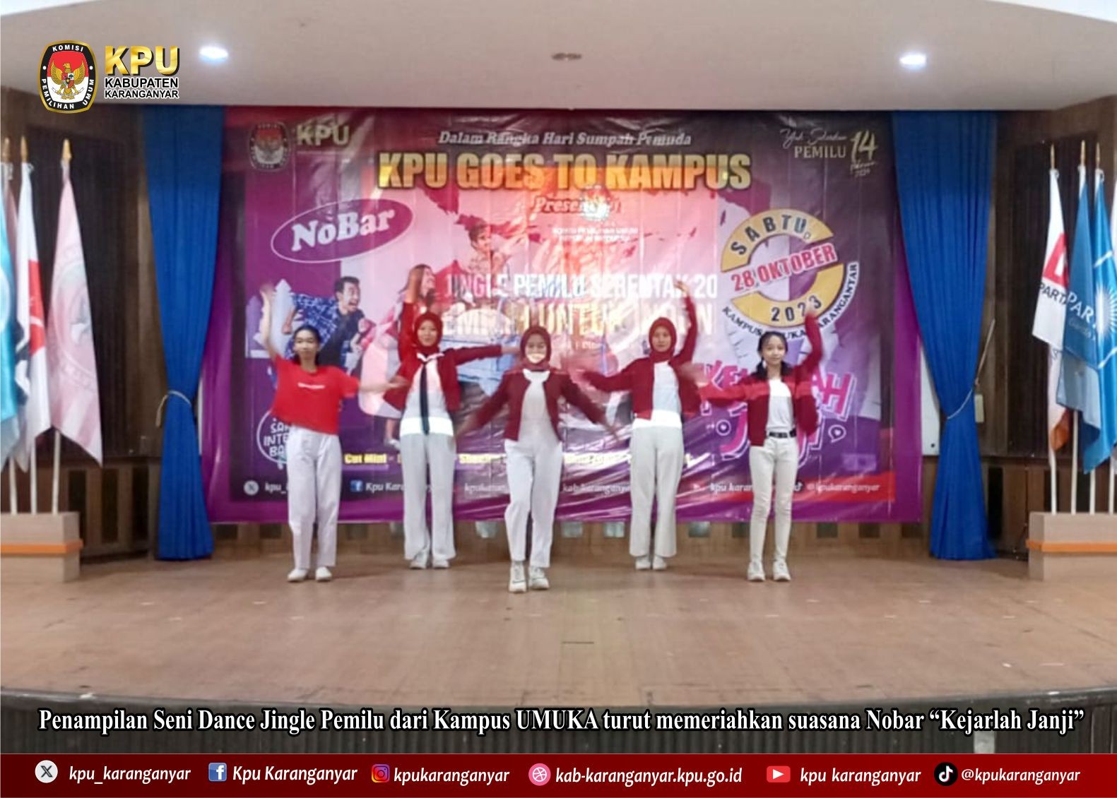Sebelum Nonton Bareng Film Kejarlah Janji berlangsung, ditampilkan Seni Dance Jingle Pemilu dan dilanjutkan dengan pemberian Souvenir berupa Boneka Maskot Sura-Sulu kepada Kampus UMUKA Karanganyar.