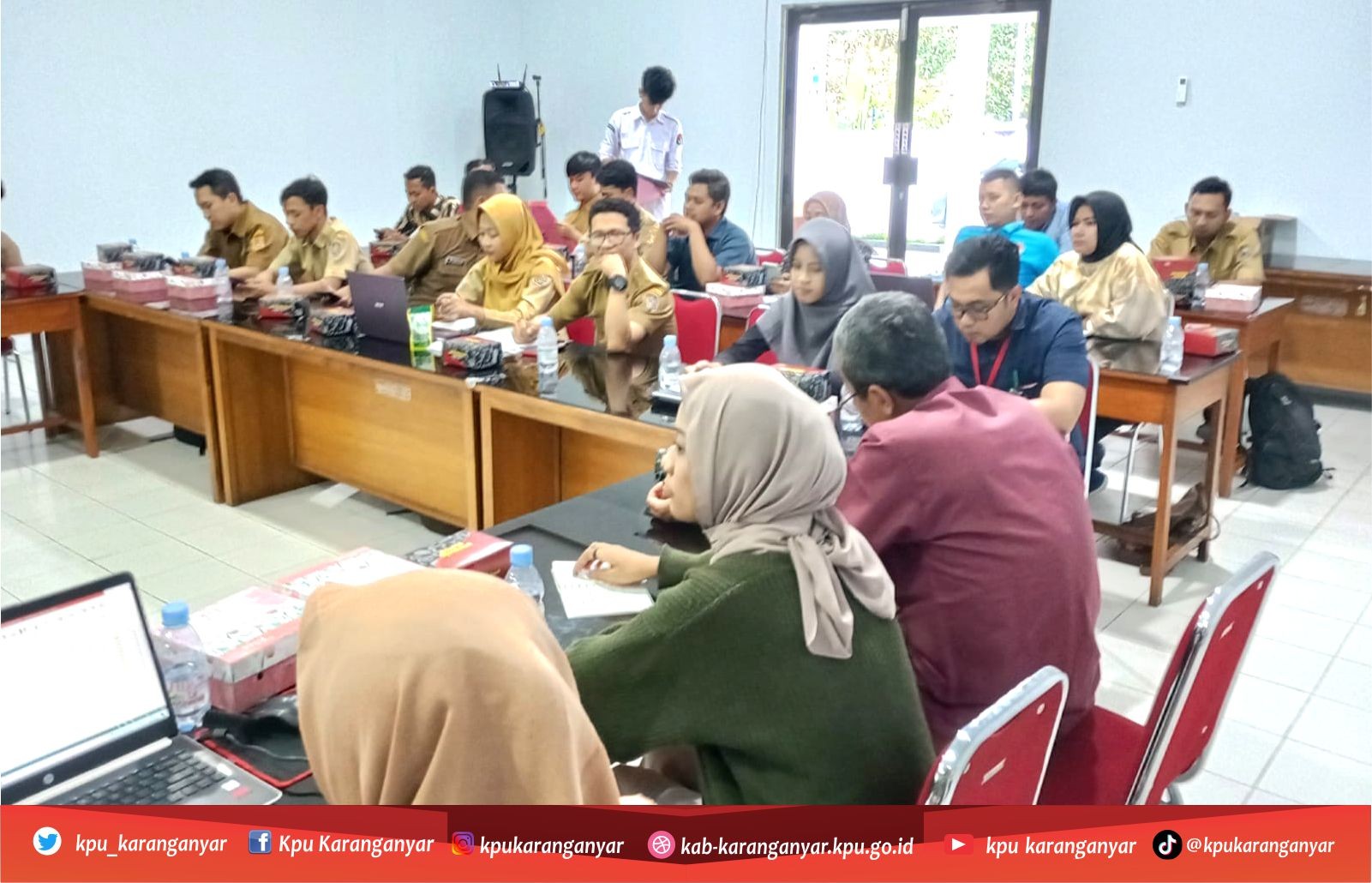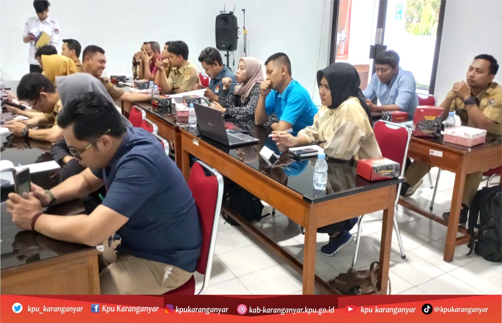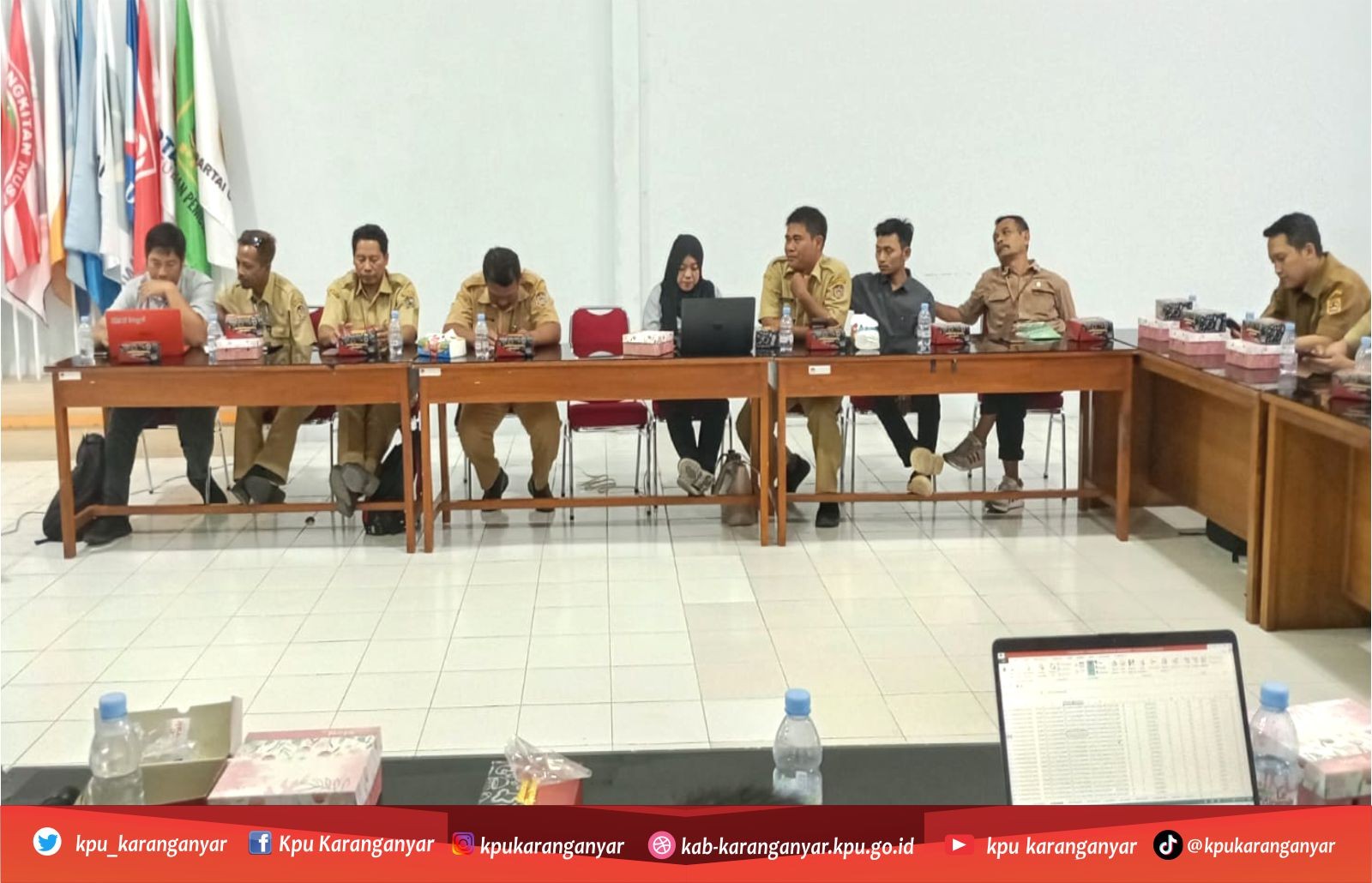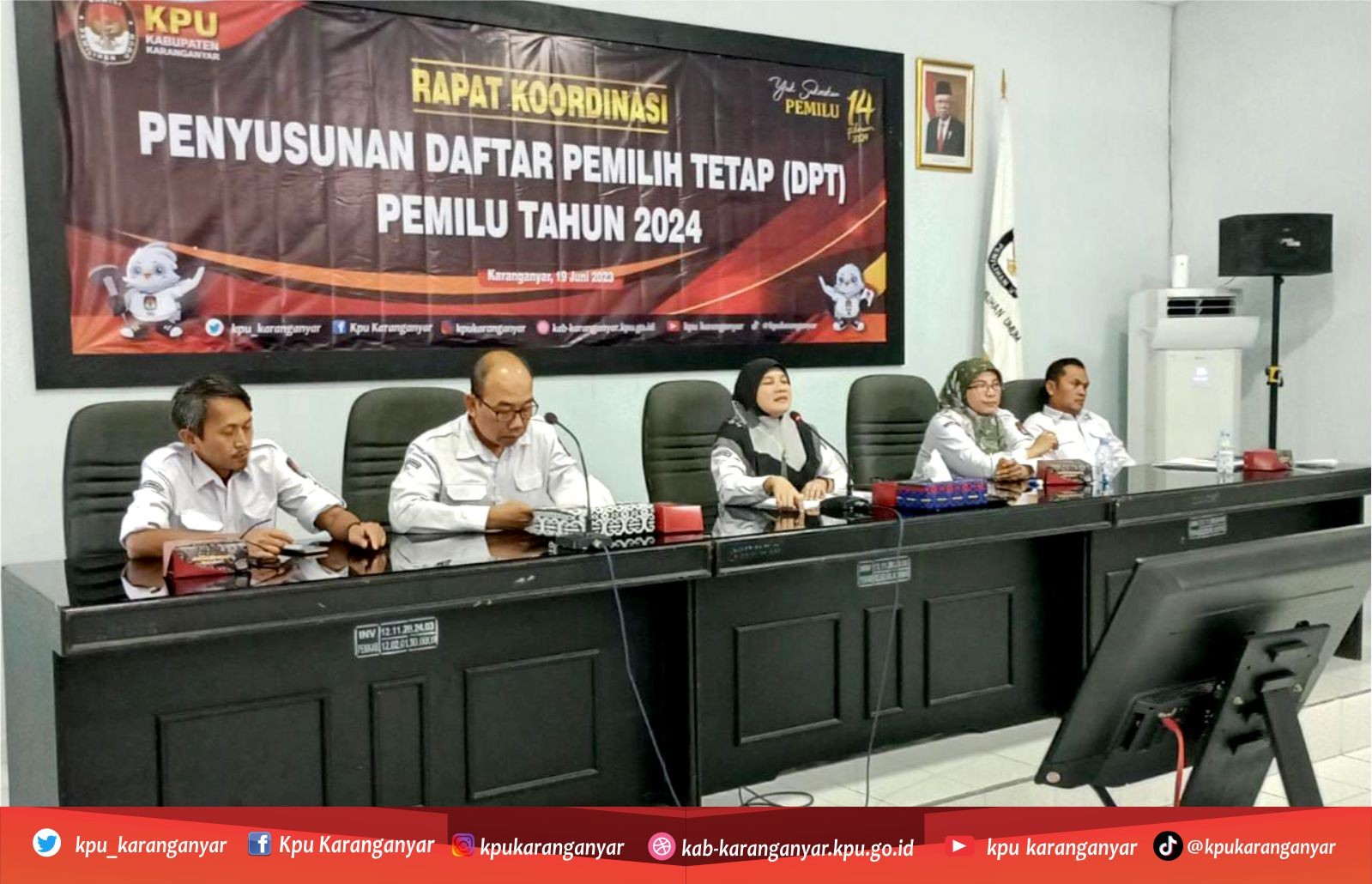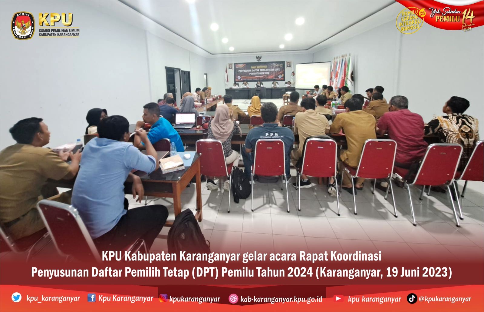 KPU Kabupaten Karanganyar gelar acara Rapat Koordinasi Penyusunan Daftar Pemilih Tetap (DPT) Pemilu Tahun 2024 di aula Kantor KPU Kabupaten Karanganyar. Rapat Koordinasi diikuti oleh Ketua dan anggota PPK Divisi Rendatin se-Kabupaten Karanganyar. Dalam acara tersebut, PPK melakukan pencermatan data yang berasal dari masukan dan tanggapan masyarakat serta saran perbaikan dari Bawaslu, Senin (19 Juni 2023)