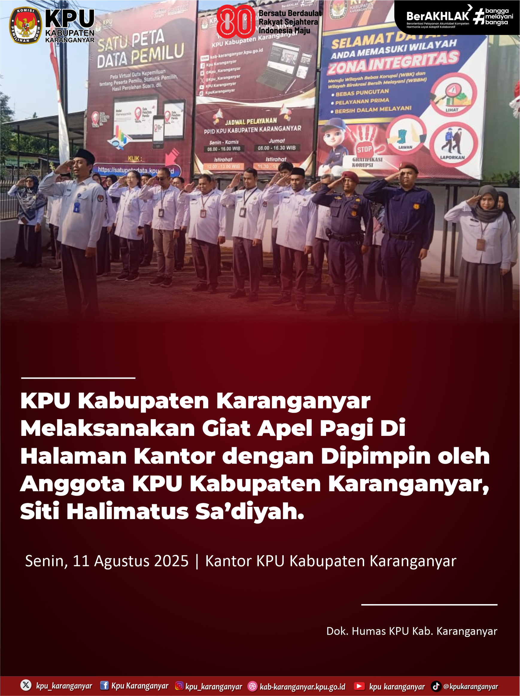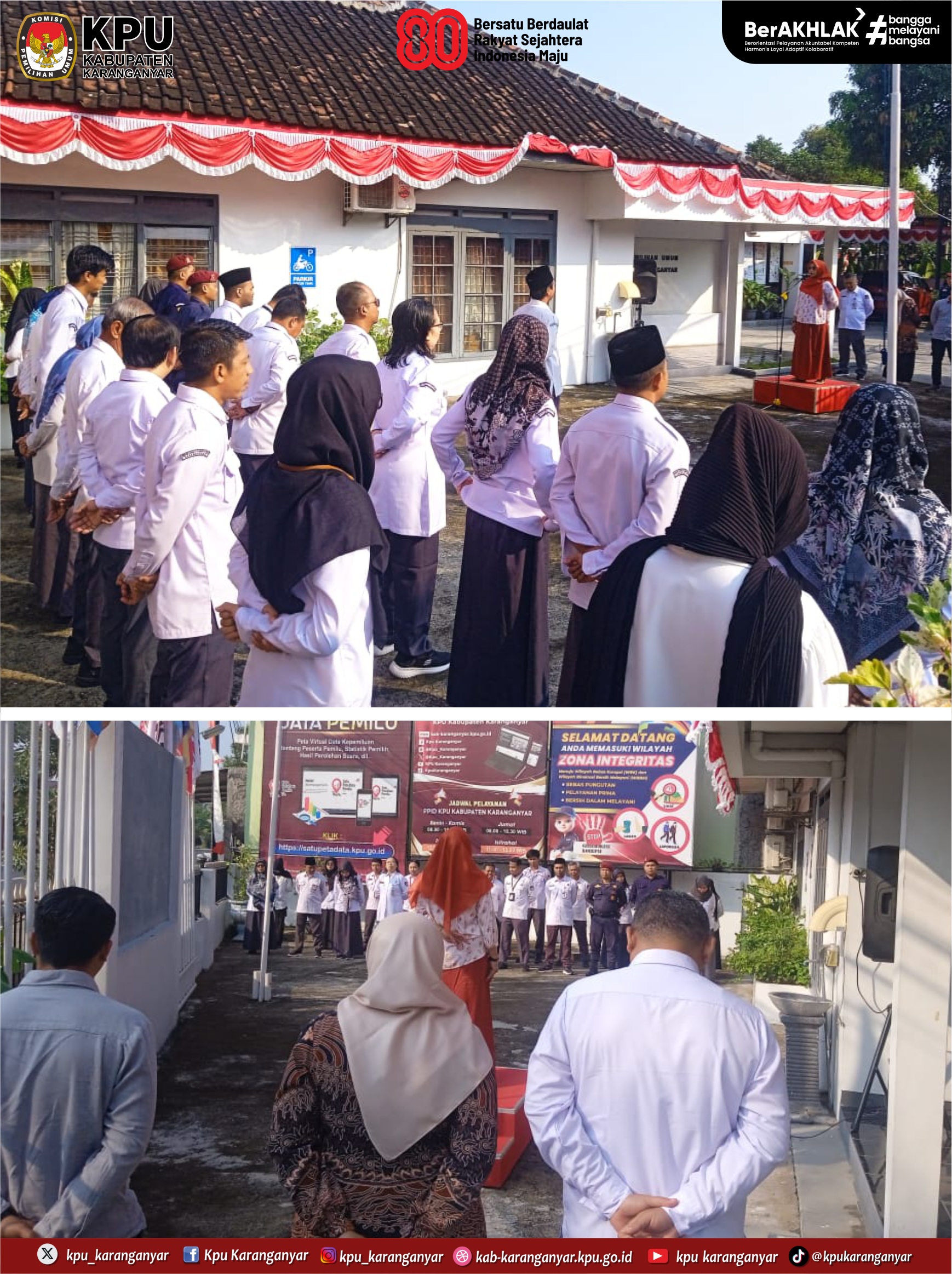 KPU Kabupaten Karanganyar Melaksanakan Giat Apel Pagi di Halaman Kantor KPU Kabupaten Karanganyar dengan dipimpin oleh Anggota KPU Kabupaten Karanganyar, Siti Halimatus Sa'diyah, Senin (11 Agustus 2025).