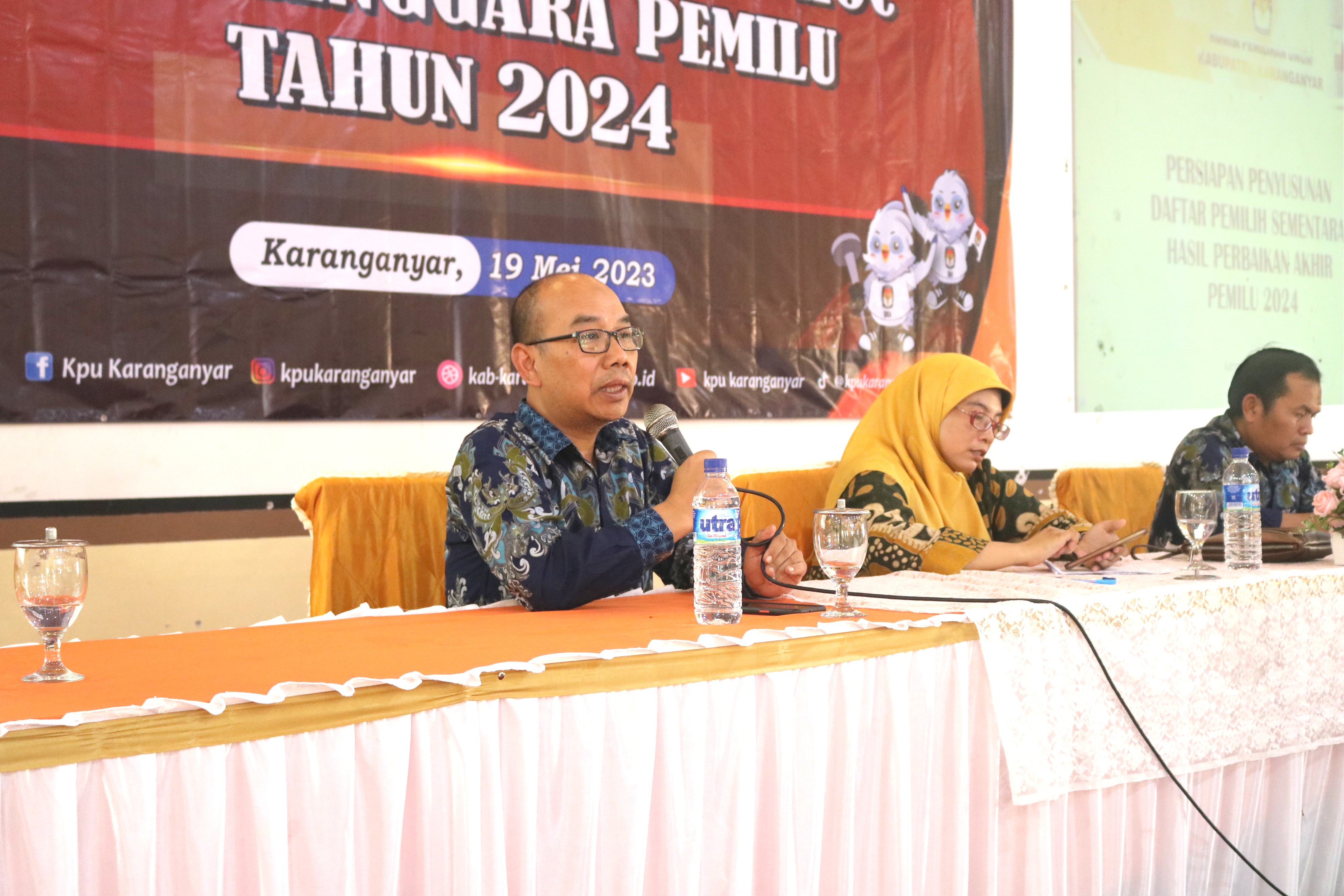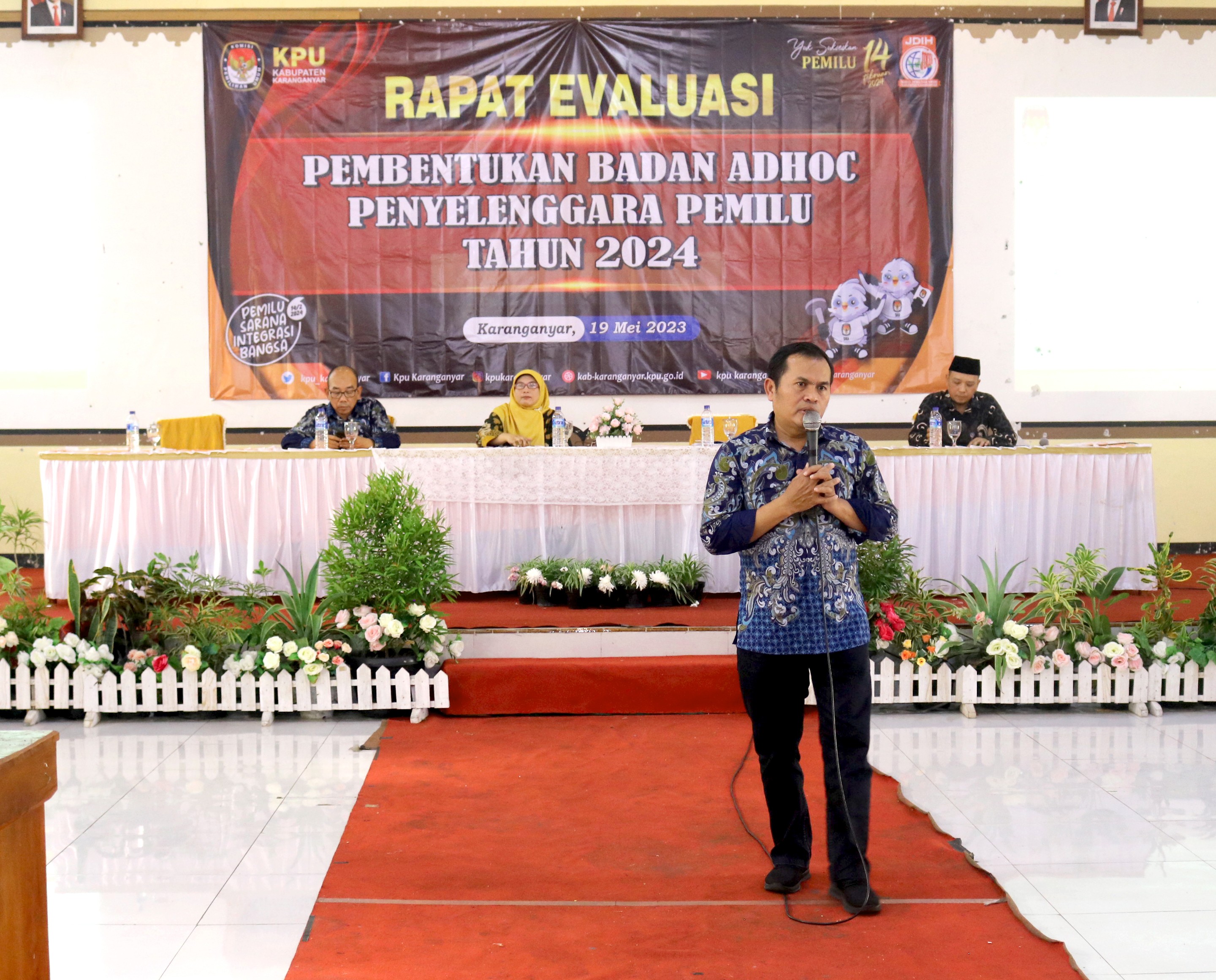 KPU Kabupaten Karanganyar menggelar Rapat Evaluasi Pembentukan Badan Adhoc Pemilu Serentak 2024, Jumat (19/05/2023) di Permatasari Hotel Karanganyar yang dihadiri oleh Ketua dan Anggota PPK, Sekretariat PPK, Tenaga Pendukung Sekretariat PPK se-Kabupaten Karanganyar, dan Dinas Instansi terkait.