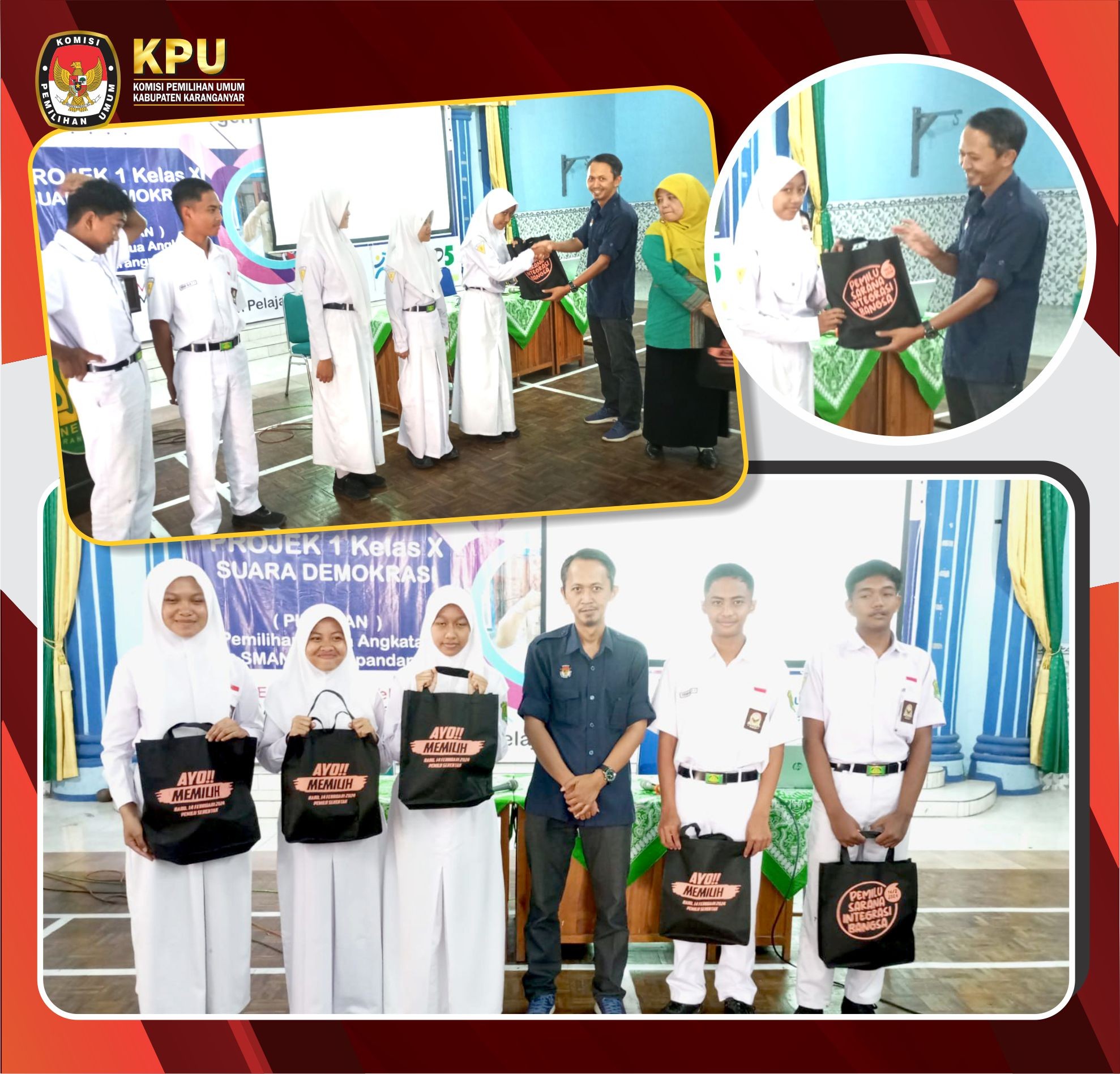 KPU Kabupaten Karanganyar Menjadi Narasumber dalam Acara Sosialisasi Pendidikan Pemilih dengan tema materi “Suara Demokrasi” di SMA Negeri Karangpandan. Kegiatan tersebut dalam rangka Pembelajaran P5 (Project Penguatan Profil Pelajaran Pancasila) dalam rangka implementasi kurikulum merdeka dan juga mengenalkan pendidikan pemilih bagi pemula di SMA Negeri Karangpandan.