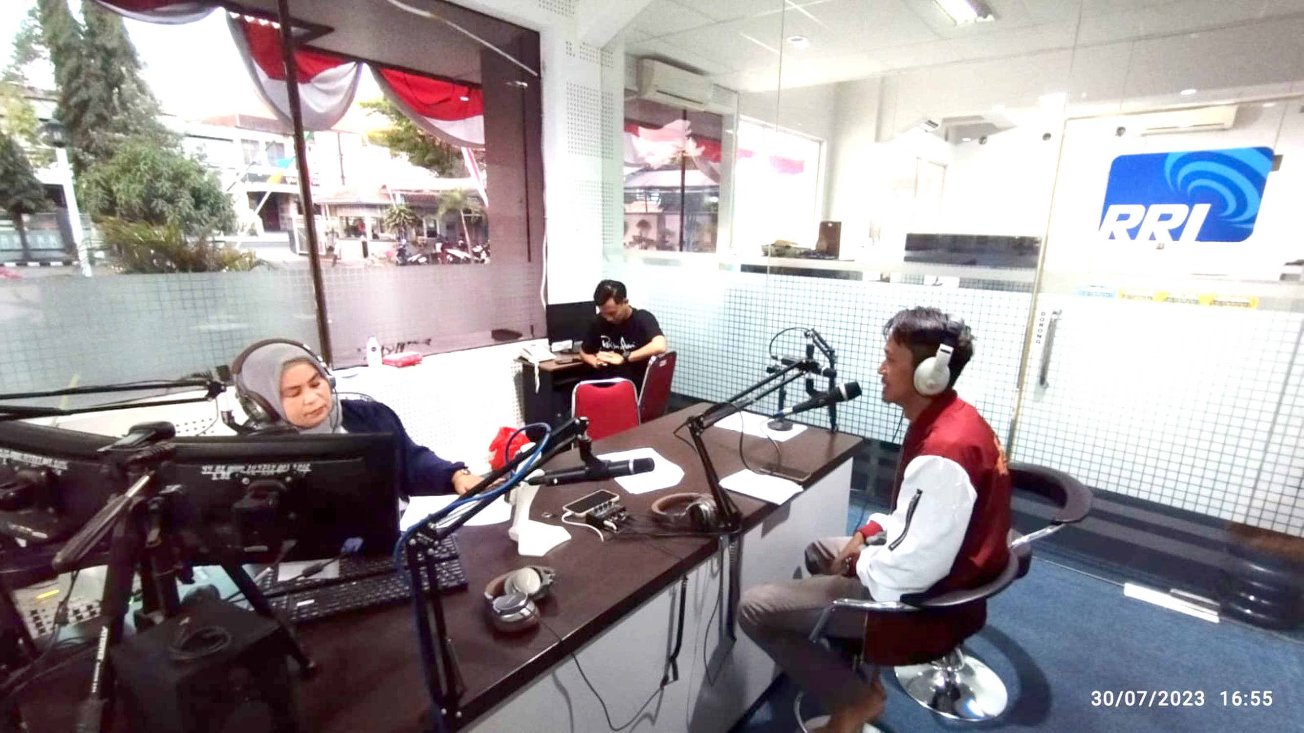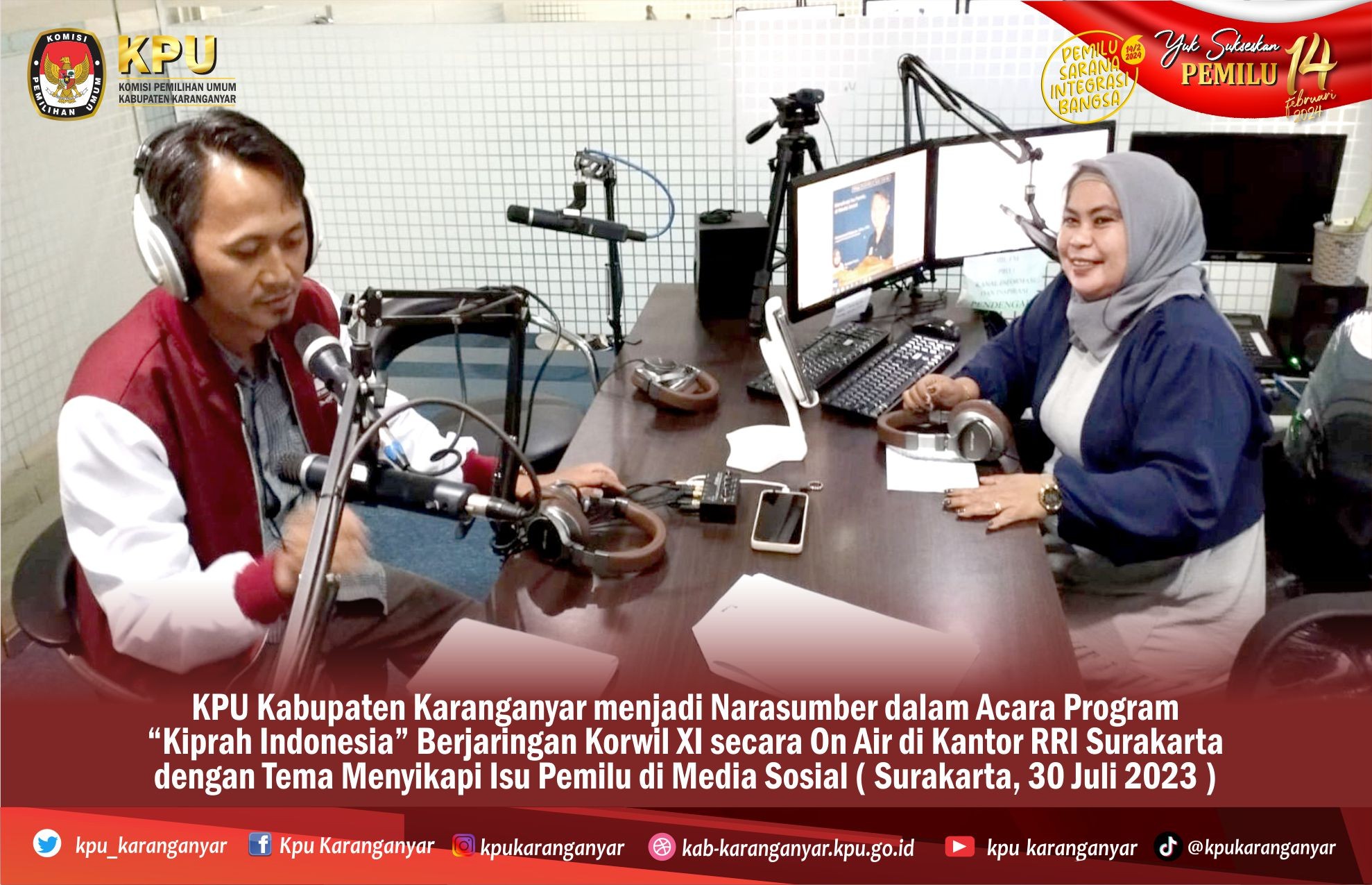 Anggota KPU Kabupaten Karanganyar Divisi Teknis, Muhammad Maksum menjadi Narasumber dalam Program Acara Kiprah Indonesia Berjaringan Korwil XI secara On Air di Kantor RRI Kota Surakarta (Surakarta, 30 Juli 2023) bersama Host RRI, Riandani Surya.
