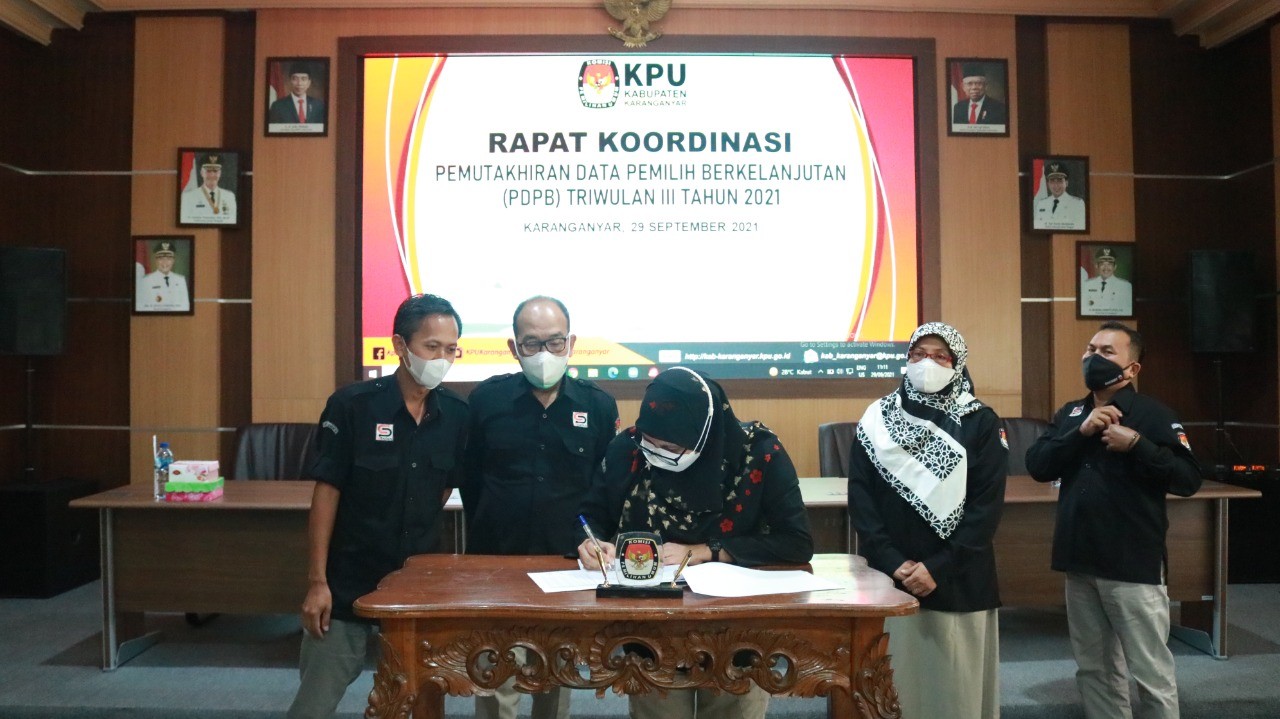 Ketua KPU Karanganyar, Triastuti Suryandari menandatangani Berita Acara Rapat Koordinasi Pemutakhiran Data Pemilih Berkelanjutan Triwulan III, Rabu (29/09/2021)
