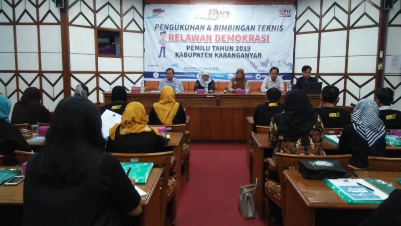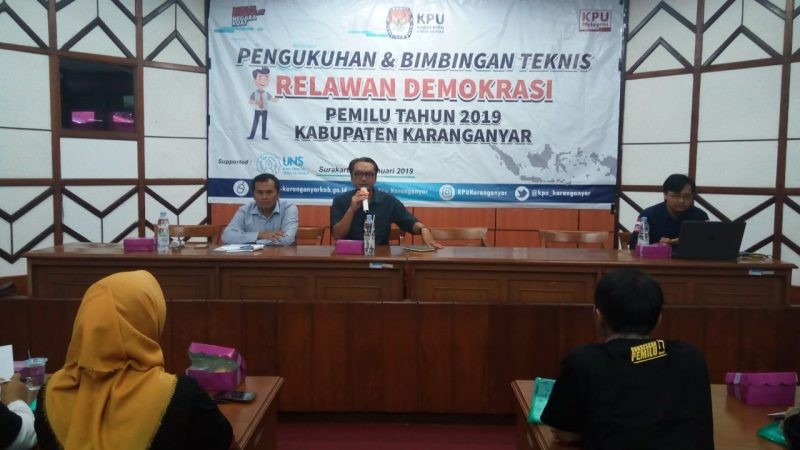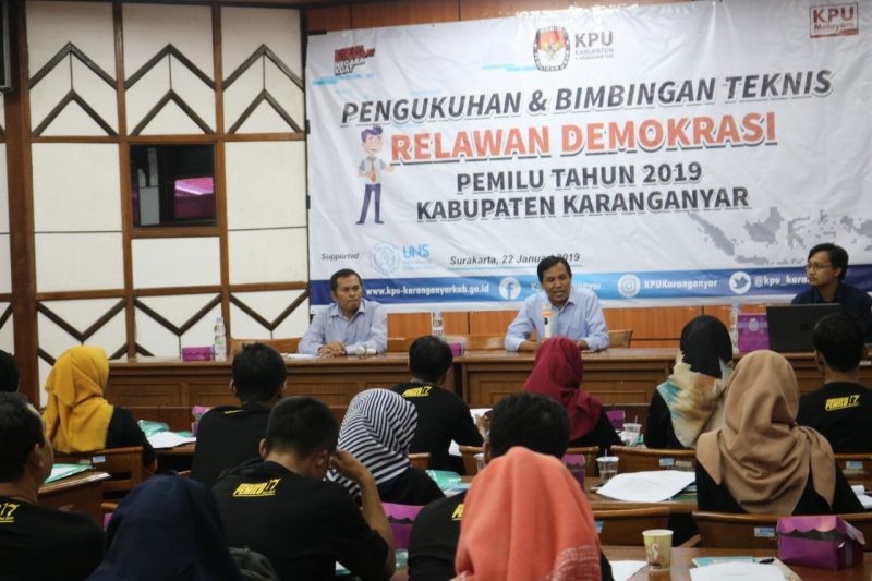 Selasa, 22 Januari 2019 – Komisi Pemilihan Umum (KPU) Kabupaten Karanganyar memberi pembekalan bagi 55 Relawan Demokrasi (Relasi) Pemilu Tahun 2019 untuk Kabupaten Karanganyar. Pembekalan bertajuk Pengukuhan dan Bimbingan Teknis digelar di Ruang Seminar Fakultas Ilmu Sosial dan Ilmu Politik (FISIP) UNS Surakarta.