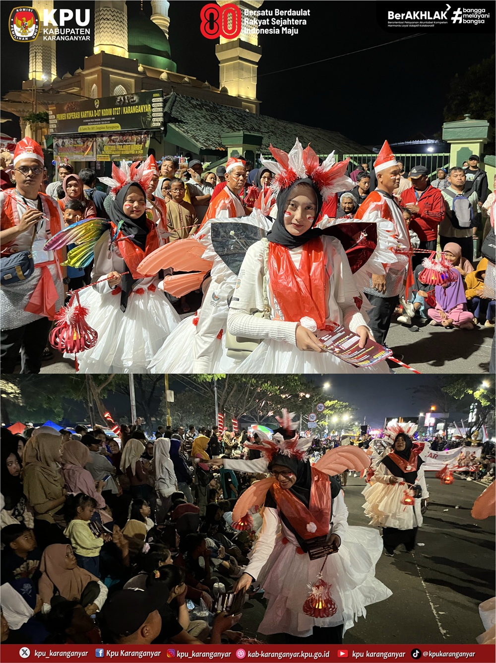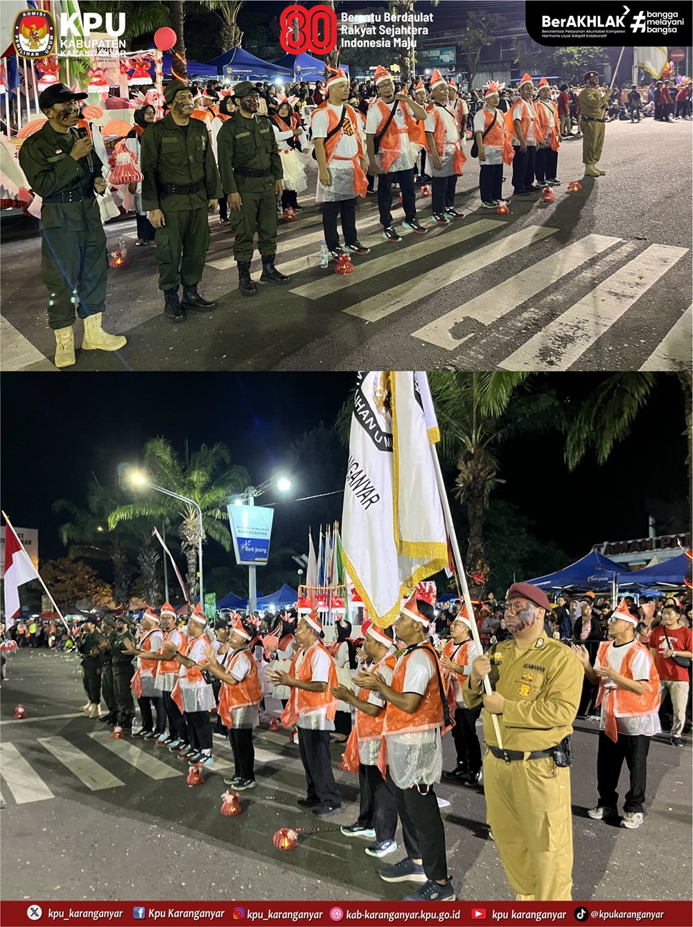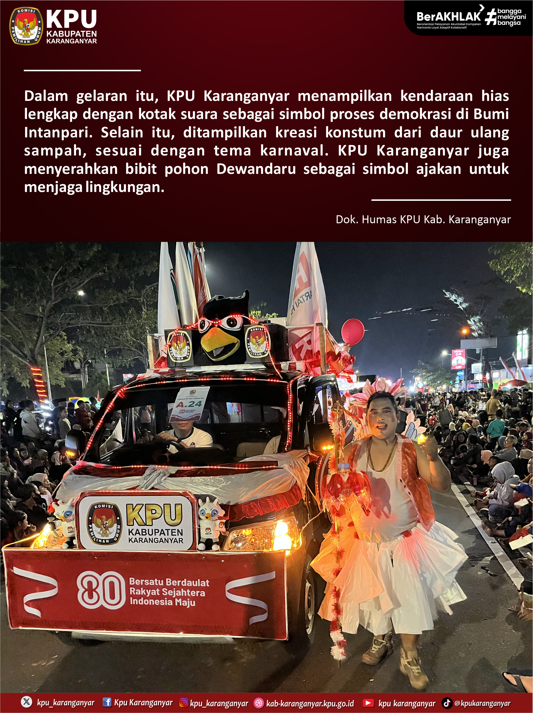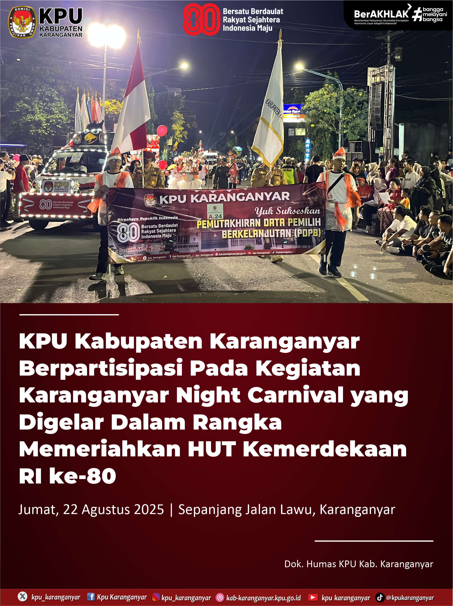 KPU Karanganyar berpartisipasi sebagai peserta dalam kegiatan Karanganyar Night Carnival yang digelar Pemkab Karanganyar, Jumat (22/8/2025) malam. Karanganyar Night Carnival diselenggarakan untuk memeriahkan HUT ke-80 Kemerdekaan RI.