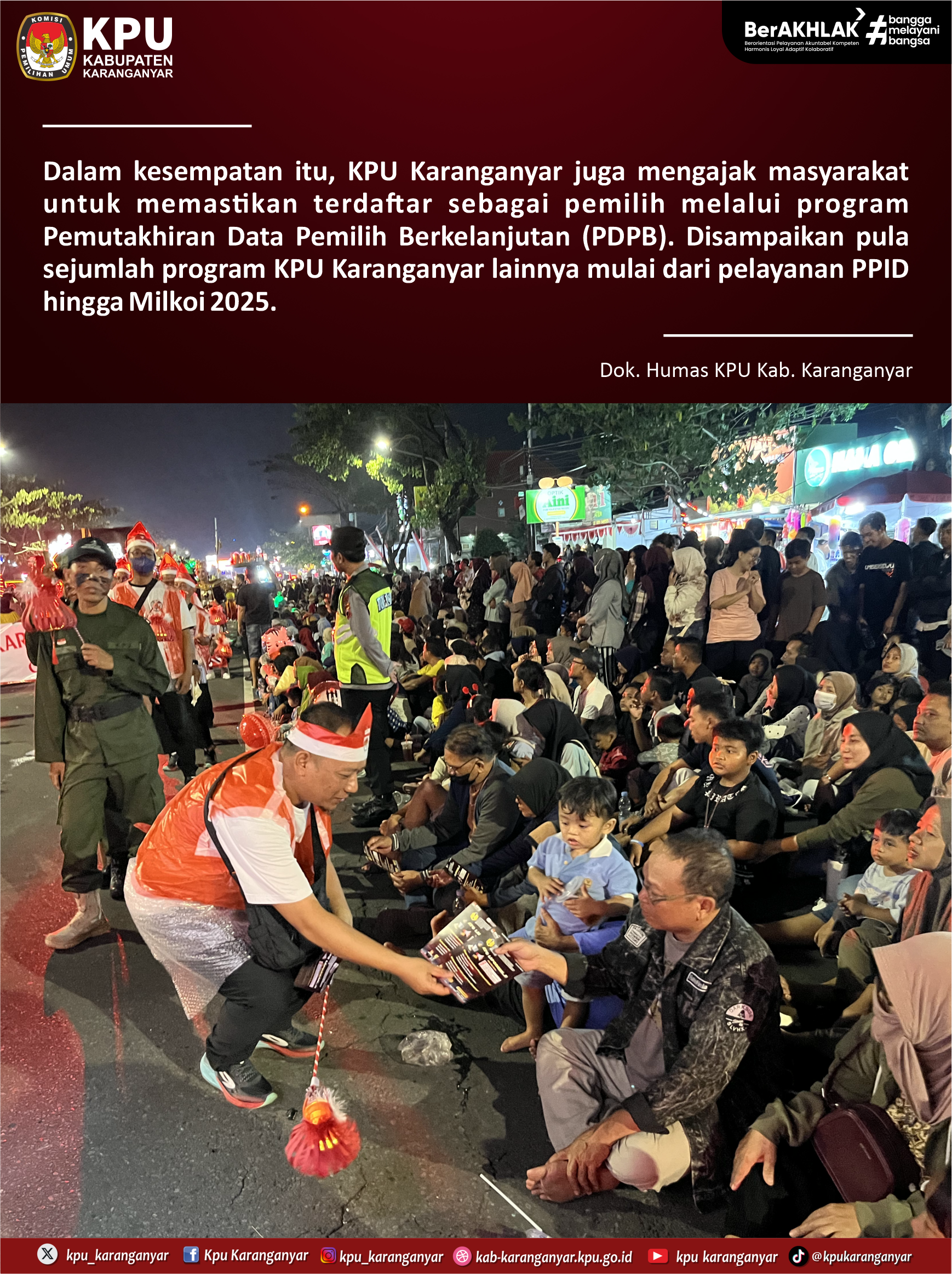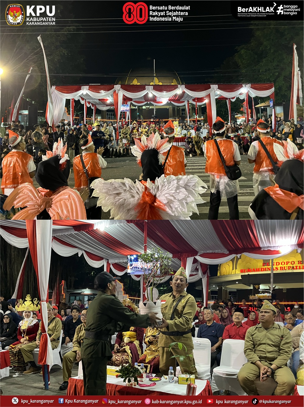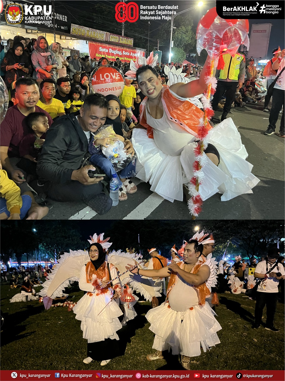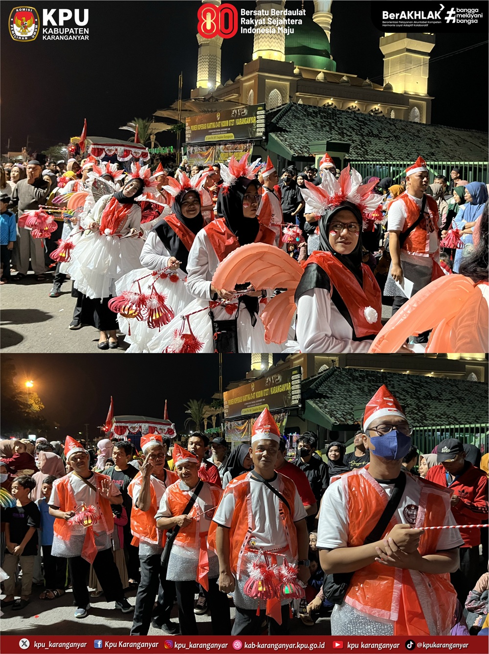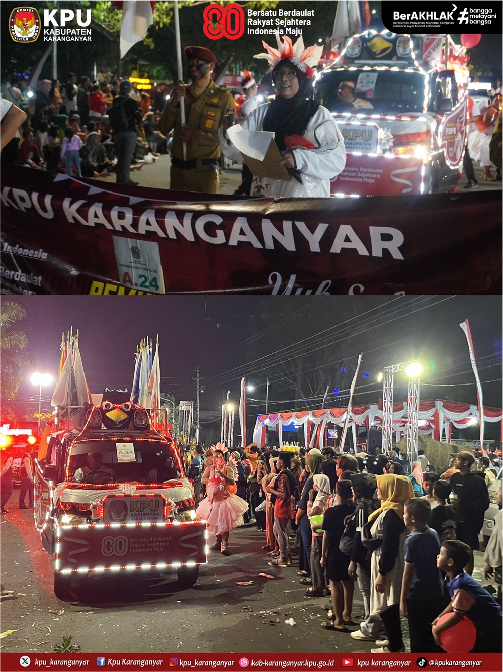 KPU Karanganyar berpartisipasi sebagai peserta dalam kegiatan Karanganyar Night Carnival yang digelar Pemkab Karanganyar, Jumat (22/8/2025) malam. Karanganyar Night Carnival diselenggarakan untuk memeriahkan HUT ke-80 Kemerdekaan RI.