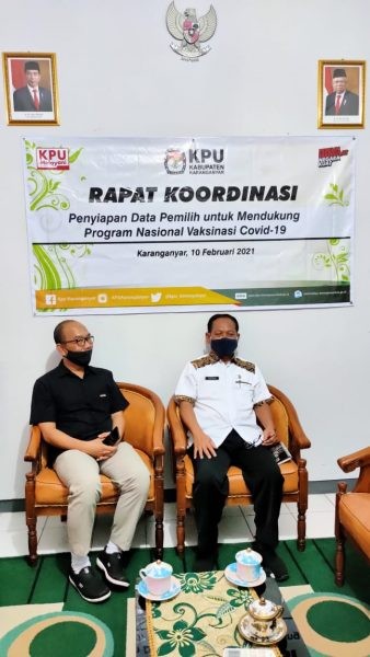 KARANGANYAR – KPU Karanganyar persiapkan Data Pemilih untuk Mendukung Program Nasional Vaksinasi Covid-19. Menindaklanjuti Surat Ketua Komisi Pemilihan Umum (KPU) RI Nomor 134/PL.02.1-SD/01/KPU/II/2021 tanggal 4 Februari 2021 Perihal Penyiapan Data Pemilih untuk Mendukung Program Nasional Vaksinasi Covid-19, KPU Karanganyar lakukan koordinasi dengan Dinas Kependudukan dan Catatan Sipil Karanganyar terkait pengecekan kegandaan dan perbaikan data invalid.