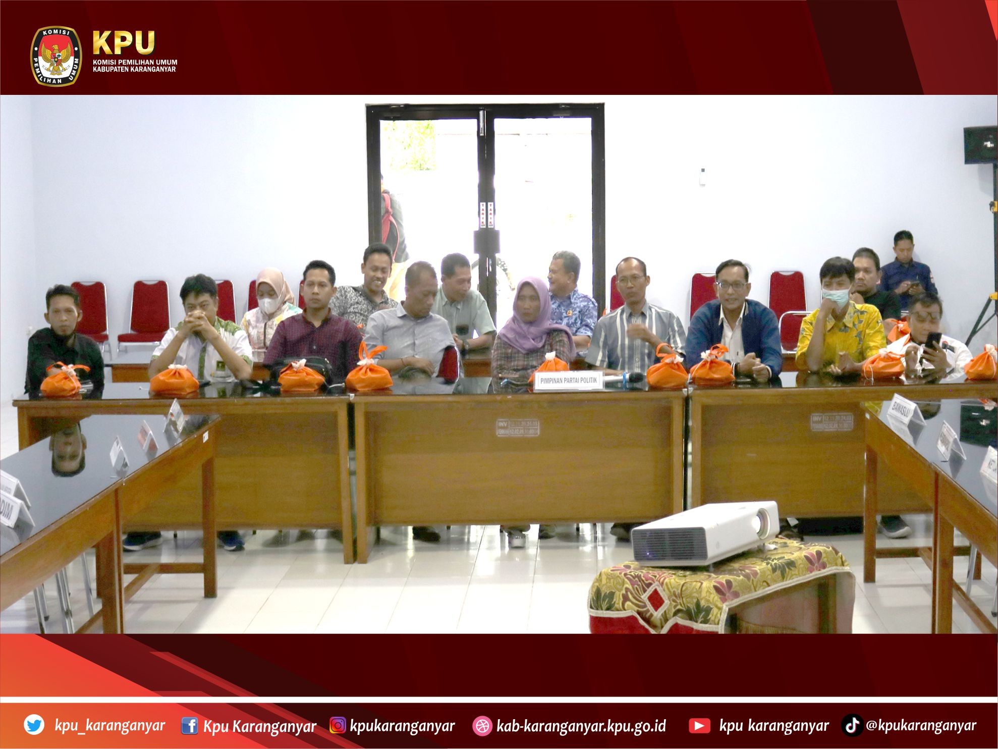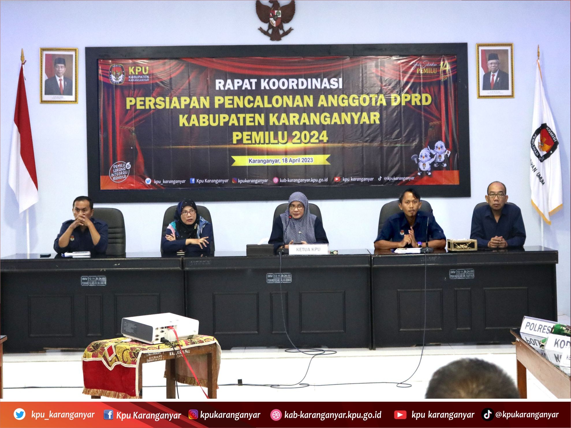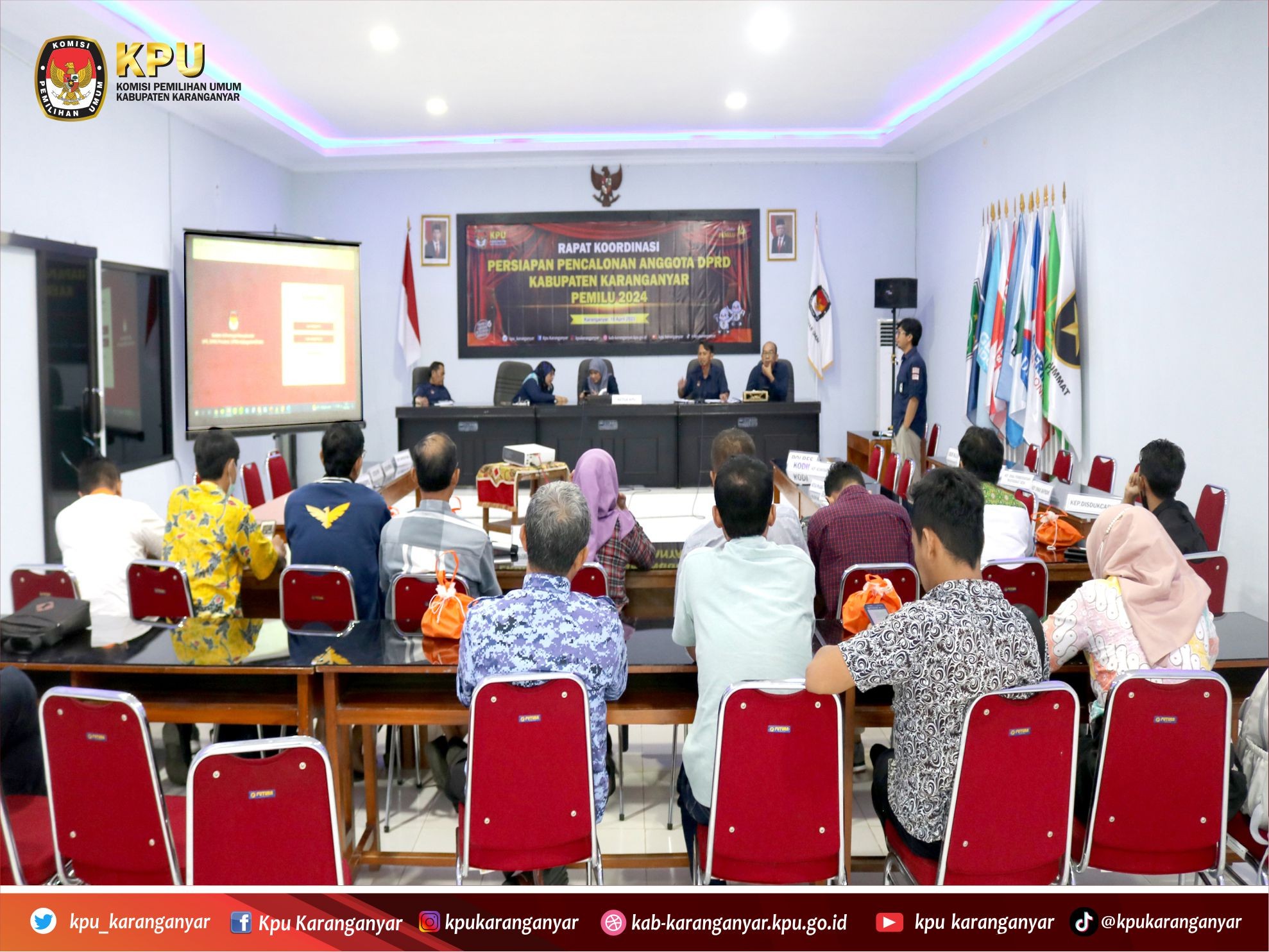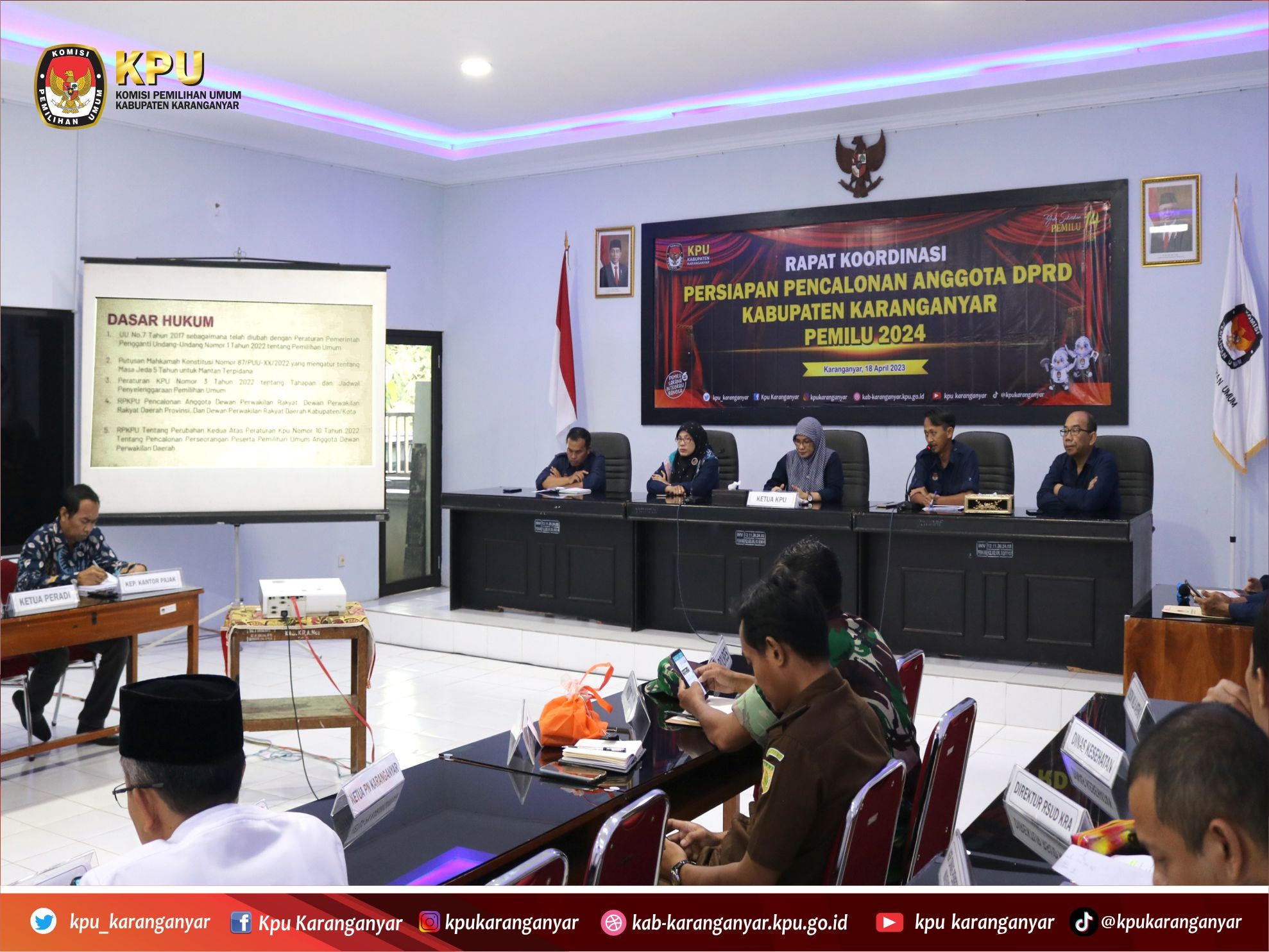 KPU Kabupaten Karanganyar menggelar rapat koordinasi persiapan pencalonan Anggota Dewan Perwakilan Rakyat Daerah (DPRD) Kabupaten Karanganyar pada Selasa (18/04/2023). Rakor bertempat di Kantor KPU Karanganyar, Jalan Tentara Pelajar, Tegalasri Bejen Karanganyar.