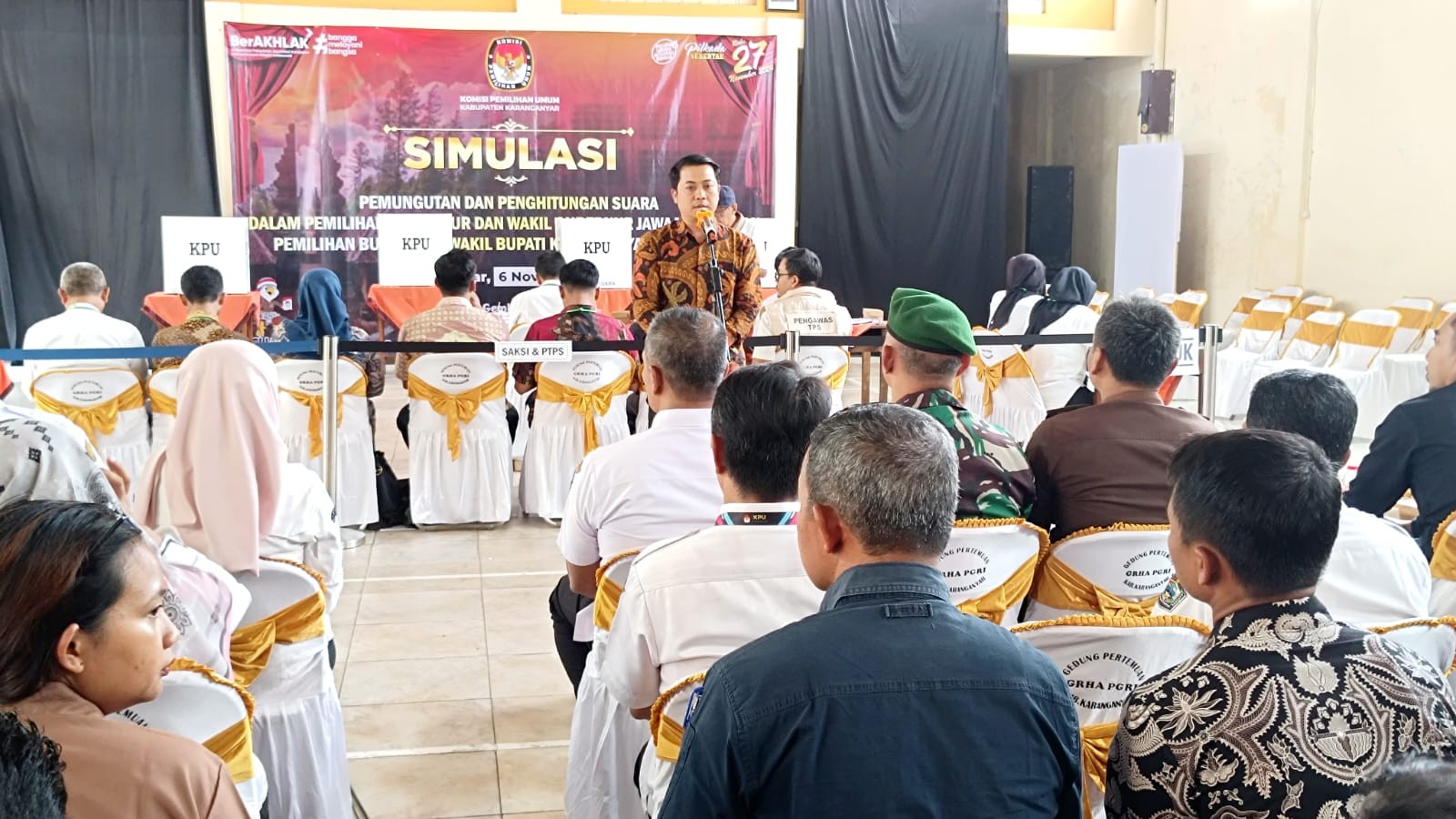 KARANGANYAR – Komisi Pemilihan Umum (KPU) Kabupaten Karanganyar menggelar Simulasi Pemungutan dan Penghitungan Suara untuk Pemilihan Gubernur dan Wakil Gubernur Jawa Tengah serta Pemilihan Bupati dan Wakil Bupati Karanganyar pada Rabu (6/11/2024). Simulasi dilaksanakan di Gedung Guru PGRI, Tegalasri, Bejen, Karanganyar.