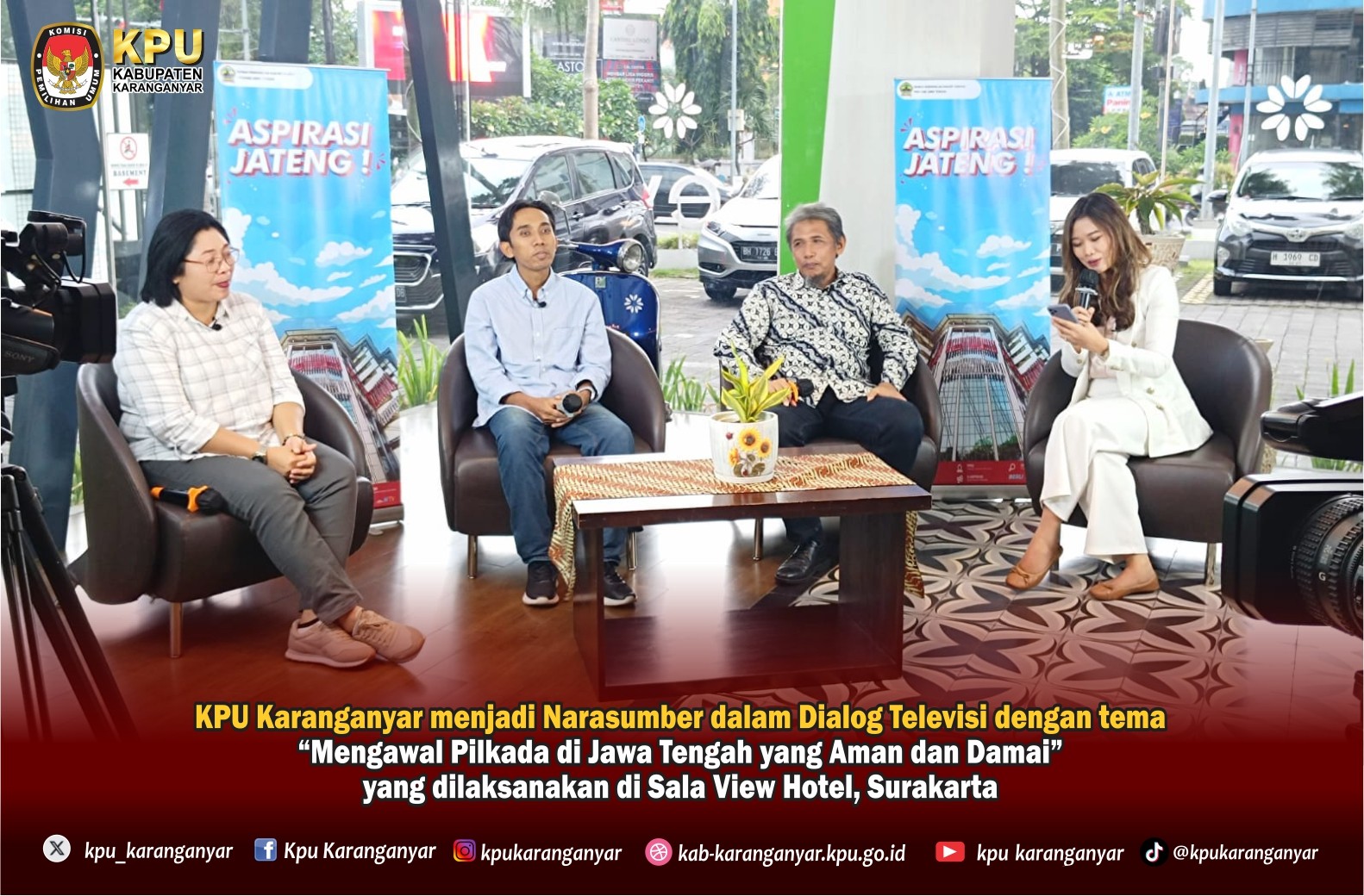 KPU Kabupaten Karanganyar menjadi Narasumber dalam Acara Dialog Televisi dengan tema "Mengawal Pilkada di Jawa Tengah yang Aman dan Damai" bersama Sekretariat DPRD Provinsi Jawa Tengah yang diselenggarakan di Sala View Hotel pada Jumat (05/04/2024). Acara ini disiarkan secara tunda melalui Media Televisi Lokal Jawa Tengah.